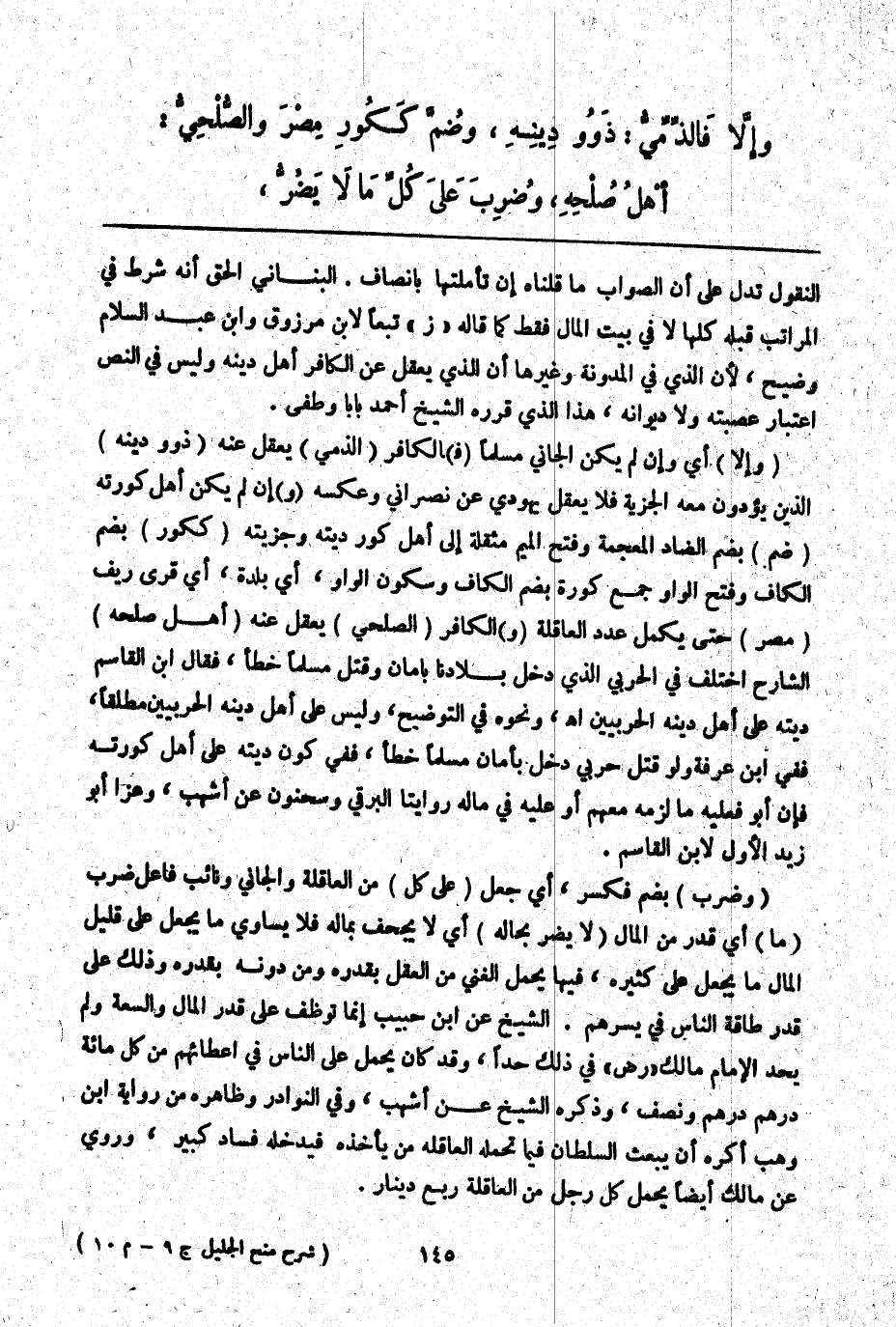 (وَضُرِبَ) بِضَمٍّ فَكَسْرٍ، أَيْ جُعِلَ (عَلَى كُلٍّ) مِنْ الْعَاقِلَةِ وَالْجَانِي وَنَائِبُ فَاعِلِ ضُرِبَ (مَا) أَيْ قَدْرٌ مِنْ الْمَالِ (لَا يَضُرُّ بِحَالِهِ) أَيْ لَا يُجْحِفُ بِمَالِهِ فَلَا يُسَاوِي مَا يُجْعَلُ عَلَى قَلِيلِ الْمَالِ مَا يُجْعَلُ عَلَى كَثِيرِهِ، فِيهَا يَحْمِلُ الْغَنِيُّ مِنْ الْعَقْلِ بِقَدْرِهِ وَمِنْ دُونِهِ بِقَدْرِهِ وَذَلِكَ عَلَى قَدْرِ طَاقَةِ النَّاسِ فِي يُسْرِهِمْ. الشَّيْخُ عَنْ ابْنِ حَبِيبٍ إنَّمَا تُوَظَّفُ عَلَى قَدْرِ الْمَالِ وَالسَّعَةِ وَلَمْ يَحُدَّ الْإِمَامُ مَالِكٌ - رَضِيَ اللَّهُ عَنْهُ - فِي ذَلِكَ حَدًّا، وَقَدْ كَانَ يَحْمِلُ عَلَى النَّاسِ فِي إعْطَائِهِمْ مِنْ كُلِّ مِائَةِ دِرْهَمٍ دِرْهَمًا وَنِصْفًا، وَذَكَرَهُ الشَّيْخُ عَنْ أَشْهَبَ، وَفِي النَّوَادِرِ وَظَاهِرُهُ مِنْ رِوَايَةِ ابْنِ وَهْبٍ أَكْرَهُ أَنْ يَبْعَثَ السُّلْطَانُ فِيمَا تَحْمِلُهُ الْعَاقِلَةُ مَنْ يَأْخُذُهُ فَيَدْخُلُهُ فَسَادٌ كَبِيرٌ، وَرُوِيَ عَنْ مَالِكٍ أَيْضًا يَحْمِلُ كُلُّ رَجُلٍ مِنْ الْعَاقِلَةِ رُبُعَ دِينَارٍ