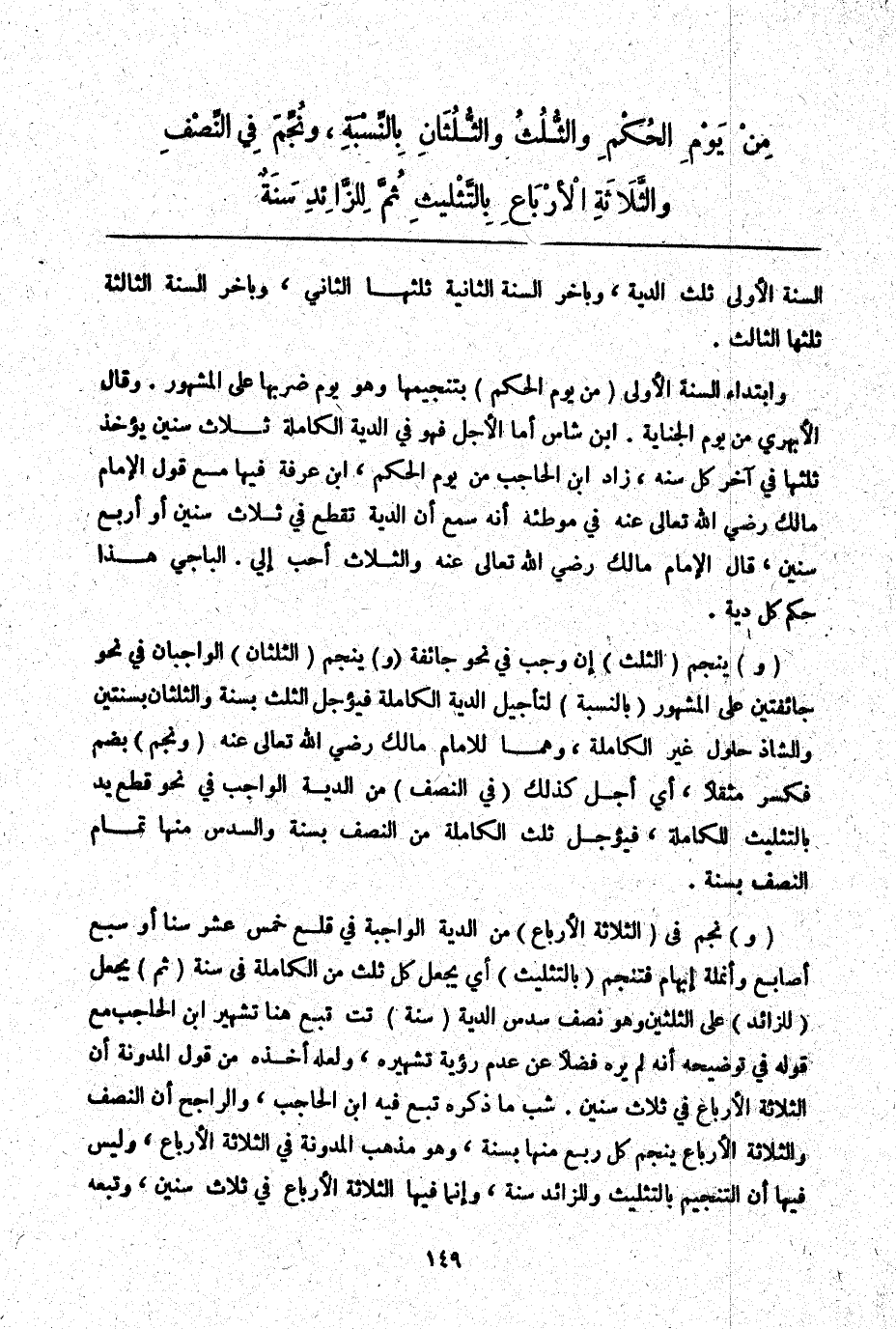 ـــــــــــــــــــــــــــــQالسَّنَةِ الْأُولَى ثُلُثُ الدِّيَةِ، وَبِآخِرِ السَّنَةِ الثَّانِيَةِ ثُلُثُهَا الثَّانِي، وَبِآخِرِ السَّنَةِ الثَّالِثَةِ ثُلُثُهَا الثَّالِثُ.