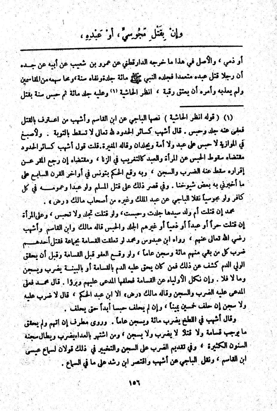 ـــــــــــــــــــــــــــــQأَوْ ذِمِّيٌّ، وَالْأَصْلُ فِي هَذَا مَا خَرَّجَهُ الدَّارَقُطْنِيُّ عَنْ عَمْرِو بْنِ شُعَيْبٍ عَنْ أَبِيهِ عَنْ جَدِّهِ «أَنَّ رَجُلًا قَتَلَ عَبْدَهُ مُتَعَمِّدًا فَجَلَدَهُ النَّبِيُّ - صَلَّى اللَّهُ عَلَيْهِ وَسَلَّمَ - مِائَةَ جَلْدَةٍ وَنَفَاهُ سَنَةً، وَمَحَا سَهْمَهُ مِنْ الْمُقَاسِمِينَ وَلَمْ يُعَذِّبْهُ وَأَمَرَهُ أَنْ يَعْتِقَ رَقَبَةً» ، اُنْظُرْ الْحَاشِيَةَ وَعَلَيْهِ جَلْدُ مِائَةٍ ثُمَّ حَبْسُ سَنَةٍ بِقَتْلِ