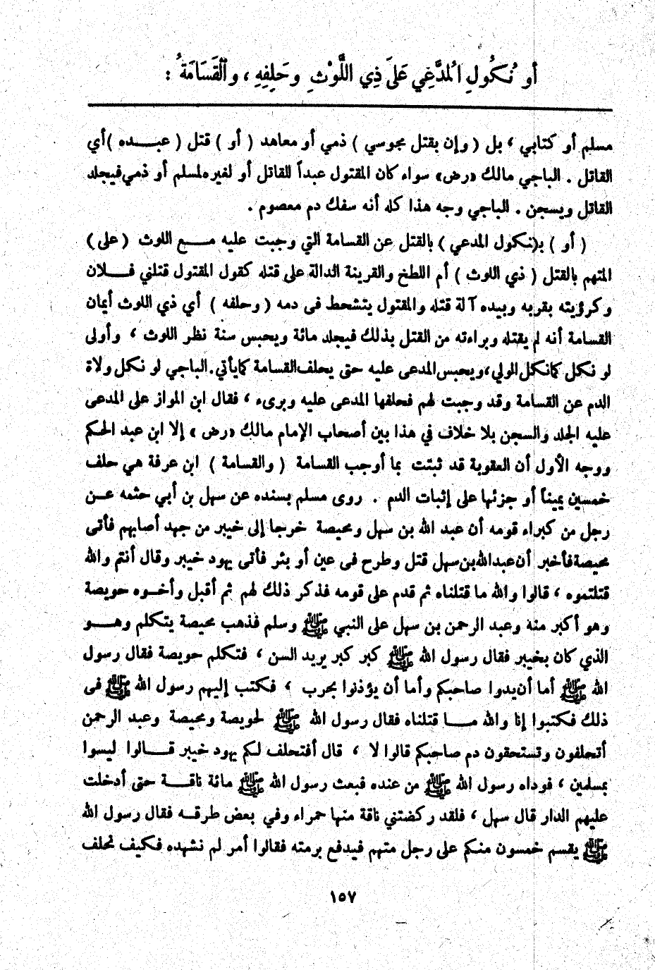 (وَالْقَسَامَةُ) ابْنُ عَرَفَةَ هِيَ حَلِفُ خَمْسِينَ يَمِينًا أَوْ جُزْئِهَا عَلَى إثْبَاتِ الدَّمِ. رَوَى مُسْلِمٌ بِسَنَدِهِ عَنْ سَهْلِ بْنِ أَبِي حَثْمَةَ عَنْ رَجُلٍ مِنْ كُبَرَاءِ قَوْمِهِ «أَنَّ عَبْدَ اللَّهِ بْنَ سَهْلٍ وَمُحَيِّصَةَ خَرَجَا إلَى خَيْبَرَ مِنْ جَهْدٍ أَصَابَهُمْ فَأَتَى مُحَيِّصَةُ فَأَخْبَرَ أَنَّ عَبْدَ اللَّهِ بْنَ سَهْلٍ قُتِلَ وَطُرِحَ فِي عَيْنٍ أَوْ بِئْرٍ فَأَتَى يَهُودَ خَيْبَرَ وَقَالَ أَنْتُمْ وَاَللَّهِ قَتَلْتُمُوهُ، قَالُوا وَاَللَّهِ مَا قَتَلْنَاهُ ثُمَّ قَدِمَ عَلَى قَوْمِهِ فَذَكَرَ ذَلِكَ لَهُمْ ثُمَّ أَقْبَلَ وَأَخُوهُ حُوَيِّصَةُ وَهُوَ أَكْبَرُ مِنْهُ وَعَبْدُ الرَّحْمَنِ بْنُ سَهْلٍ عَلَى النَّبِيِّ - صَلَّى اللَّهُ عَلَيْهِ وَسَلَّمَ - وَسَلَّمَ فَذَهَبَ مُحَيِّصَةُ يَتَكَلَّمُ وَهُوَ الَّذِي كَانَ بِخَيْبَرَ فَقَالَ رَسُولُ اللَّهِ - صَلَّى اللَّهُ عَلَيْهِ وَسَلَّمَ - كَبِّرْ كَبِّرْ يُرِيدُ السِّنَّ، فَتَكَلَّمَ حُوَيِّصَةُ فَقَالَ رَسُولُ اللَّهِ - صَلَّى اللَّهُ عَلَيْهِ وَسَلَّمَ - إمَّا أَنْ يَدُوا صَاحِبَكُمْ وَإِمَّا أَنْ يُؤْذَنُوا بِحَرْبٍ، فَكَتَبَ إلَيْهِمْ رَسُولُ اللَّهِ - صَلَّى اللَّهُ عَلَيْهِ وَسَلَّمَ - فِي ذَلِكَ فَكَتَبُوا إنَّا وَاَللَّهِ مَا قَتَلْنَاهُ فَقَالَ رَسُولُ اللَّهِ - صَلَّى اللَّهُ عَلَيْهِ وَسَلَّمَ - لِحُوَيِّصَةَ وَمُحَيِّصَةَ وَعَبْدِ الرَّحْمَنِ أَتَحْلِفُونَ وَتَسْتَحِقُّونَ دَمَ صَاحِبِكُمْ قَالُوا لَا، قَالَ أَفَتَحْلِفُ لَكُمْ يَهُودُ خَيْبَرَ قَالُوا لَيْسُوا بِمُسْلِمِينَ، فَوَدَاهُ رَسُولُ اللَّهِ - صَلَّى اللَّهُ عَلَيْهِ وَسَلَّمَ - مِنْ عِنْدِهِ فَبَعَثَ رَسُولُ اللَّهِ - صَلَّى اللَّهُ عَلَيْهِ وَسَلَّمَ - مِائَةَ نَاقَةٍ حَتَّى أُدْخِلَتْ عَلَيْهِمْ الدَّارَ قَالَ سَهْلٌ، فَلَقَدْ رَكَضَتْنِي نَاقَةٌ مِنْهَا حَمْرَاءُ وَفِي بَعْضِ طُرُقِهِ فَقَالَ رَسُولُ اللَّهِ - صَلَّى اللَّهُ عَلَيْهِ وَسَلَّمَ - يُقْسِمُ خَمْسُونَ مِنْكُمْ عَلَى رَجُلٍ مِنْهُمْ فَيُدْفَعُ بِرُمَّتِهِ فَقَالُوا أَمْرٌ لَمْ نَشْهَدْهُ فَكَيْفَ نَحْلِفُ