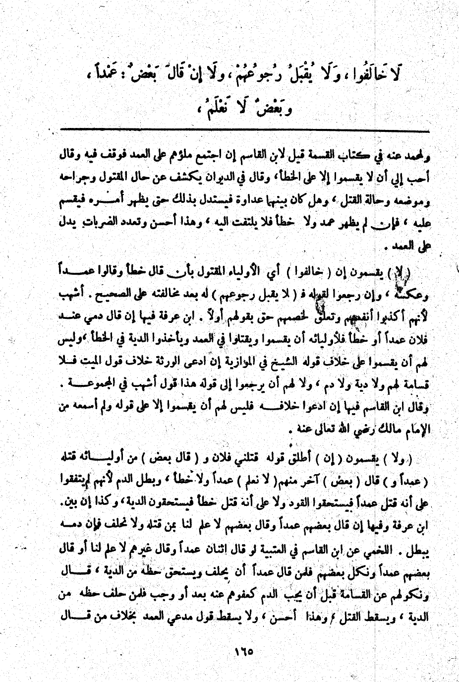 (وَلَا) يُقْسِمُونَ (إنْ) أَطْلَقَ قَوْلَهُ قَتَلَنِي فُلَانٌ وَ (قَالَ بَعْضٌ) مِنْ أَوْلِيَائِهِ قَتَلَهُ (عَمْدًا وَ) قَالَ (بَعْضٌ) آخَرُ مِنْهُمْ (لَا نَعْلَمُ) عَمْدًا وَلَا خَطَأً، وَبَطَلَ الدَّمُ لِأَنَّهُمْ لَمْ يَتَّفِقُوا عَلَى أَنَّهُ قُتِلَ عَمْدًا فَيَسْتَحِقُّوا الْقَوَدَ وَلَا عَلَى أَنَّهُ قُتِلَ خَطَأً فَيَسْتَحِقُّونَ الدِّيَةَ وَكَذَا إنْ بَيَّنَ. ابْنُ عَرَفَةَ وَفِيهَا إنْ قَالَ بَعْضُهُمْ عَمْدًا وَقَالَ بَعْضُهُمْ لَا عِلْمَ لَنَا بِمَنْ قَتَلَهُ وَلَا نَحْلِفُ فَإِنَّ دَمَهُ يَبْطُلُ. اللَّخْمِيُّ عَنْ ابْنِ الْقَاسِمِ فِي الْعُتْبِيَّةِ لَوْ قَالَ اثْنَانِ عَمْدًا وَقَالَ غَيْرُهُمْ لَا عِلْمَ لَنَا أَوْ قَالَ بَعْضُهُمْ عَمْدًا وَنَكَلَ بَعْضُهُمْ فَلِمَنْ قَالَ عَمْدًا أَنْ يَحْلِفَ وَيَسْتَحِقَّ حَظَّهُ مِنْ الدِّيَةِ، قَالَ وَنُكُولُهُمْ عَنْ الْقَسَامَةِ قَبْلَ أَنْ يَجِبَ الدَّمُ كَعَفْوِهِمْ عَنْهُ بَعْدَ أَوْ وَجَبَ فَإِنْ حَلَفَ حَظُّهُ مِنْ الدِّيَةِ، وَيَسْقُطُ الْقَتْلُ، وَهَذَا أَحْسَنُ، وَلَا يَسْقُطُ قَوْلُ مُدَّعِي الْعَمْدِ بِخِلَافِ مَنْ قَالَ