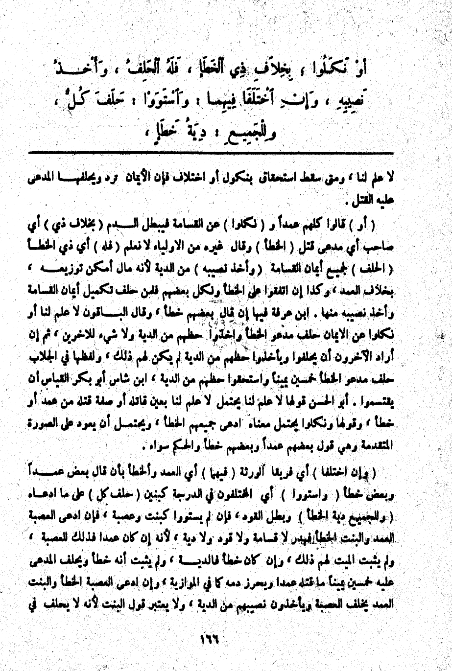 (أَوْ) قَالُوا كُلُّهُمْ عَمْدًا وَ (نَكَلُوا) عَنْ الْقَسَامَةِ فَيَبْطُلُ الدَّمُ (بِخِلَافِهِ ذِي) أَيْ صَاحِبِ أَيْ مُدَّعِي قَتْلَ (الْخَطَأِ) وَقَالَ غَيْرُهُ مِنْ الْأَوْلِيَاءِ لَا نَعْلَمُ (فَلَهُ) أَيْ ذِي الْخَطَأِ (الْحَلِفُ) لِجَمِيعِ أَيْمَانِ الْقَسَامَةِ (وَأَخْذُ نَصِيبِهِ) مِنْ الدِّيَةِ لِأَنَّهُ مَالٌ أَمْكَنَ تَوْزِيعُهُ، بِخِلَافِ الْعَمْدِ وَكَذَا إنْ اتَّفَقُوا عَلَى الْخَطَأِ وَنَكَلَ بَعْضُهُمْ فَلِمَنْ حَلَفَ تَكْمِيلُ أَيْمَانِ الْقَسَامَةِ وَأَخْذُ نَصِيبِهِ مِنْهَا. ابْنُ عَرَفَةَ فِيهَا إنْ قَالَ بَعْضُهُمْ خَطَأً، وَقَالَ الْبَاقُونَ لَا عِلْمَ لَنَا أَوْ نَكَلُوا عَنْ الْأَيْمَانِ حَلَفَ مُدَّعُو الْخَطَأِ وَأَخَذُوا حَظَّهُمْ مِنْ الدِّيَةِ وَلَا شَيْءَ لِلْآخَرِينَ، ثُمَّ إنْ أَرَادَ الْآخَرُونَ أَنْ يَحْلِفُوا وَيَأْخُذُوا حَظَّهُمْ مِنْ الدِّيَةِ لَمْ يَكُنْ لَهُمْ ذَلِكَ، وَلَفْظُهَا فِي الْجَلَّابِ حَلَفَ مُدَّعُو الْخَطَأِ خَمْسِينَ يَمِينًا وَاسْتَحَقُّوا حَظَّهُمْ مِنْ الدِّيَةِ ابْنُ شَاسٍ أَبُو بَكْرٍ الْقِيَاسُ أَنْ يَقْتَسِمُوا. أَبُو الْحَسَنِ قَوْلُهَا لَا عِلْمَ لَنَا يَحْتَمِلُ لَا عِلْمَ لَنَا بِعَيْنِ قَاتِلِهِ أَوْ صِفَةِ قَتْلِهِ مِنْ عَمْدٍ أَوْ خَطَأٍ، وَقَوْلُهَا وَنَكَلُوا يَحْتَمِلُ مَعْنَاهُ ادَّعَى جَمِيعُهُمْ الْخَطَأَ، وَيَحْتَمِلُ أَنْ يَعُودَ عَلَى الصُّورَةِ الْمُتَقَدِّمَةِ وَهِيَ قَوْلُ بَعْضِهِمْ عَمْدًا وَبَعْضِهِمْ خَطَأً وَالْحُكْمُ سَوَاءٌ.