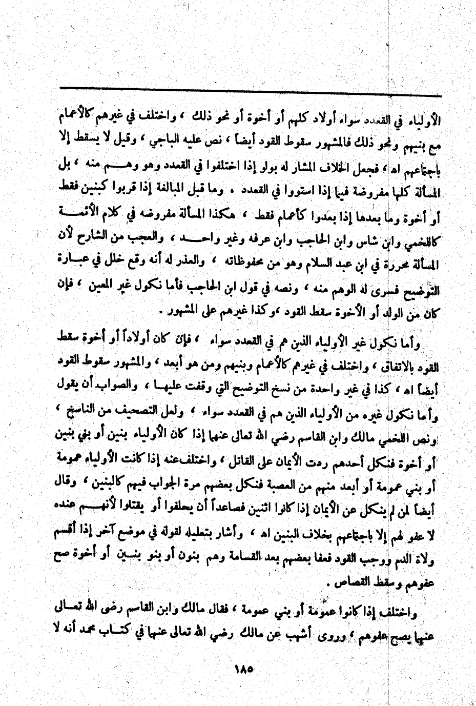 ـــــــــــــــــــــــــــــQالْأَوْلِيَاءُ فِي الْقُعْدُدِ سَوَاءٌ أَوْلَادٌ كُلُّهُمْ أَوْ إخْوَةٌ أَوْ نَحْوُ ذَلِكَ، وَاخْتُلِفَ فِي غَيْرِهِمْ كَالْأَعْمَامِ مَعَ بَنِيهِمْ وَنَحْوِ ذَلِكَ فَالْمَشْهُورُ سُقُوطُ الْقَوَدِ أَيْضًا نَصَّ عَلَيْهِ الْبَاجِيَّ، وَقِيلَ لَا يَسْقُطُ إلَّا بِاجْتِمَاعِهِمْ. اهـ. فَجُعِلَ الْخِلَافُ الْمُشَارُ لَهُ بِلَوْ إذَا اخْتَلَفُوا فِي الْقُعْدُدِ وَهُوَ وَهْمٌ مِنْهُ، بَلْ الْمَسْأَلَةُ كُلُّهَا مَفْرُوضَةٌ فِيمَا إذَا اسْتَوَوْا فِي الْقُعْدُدِ، وَمَا قَبْلَ الْمُبَالَغَةِ إذَا قَرُبُوا كَبَنِينَ فَقَطْ أَوْ إخْوَةٍ وَمَا بَعْدَهَا إذَا بَعُدُوا كَأَعْمَامٍ فَقَطْ، هَكَذَا الْمَسْأَلَةُ مَفْرُوضَةٌ فِي كَلَامِ الْأَئِمَّةِ كَاللَّخْمِيِّ وَابْنِ شَاسٍ وَابْنِ الْحَاجِبِ وَابْنِ عَرَفَةَ وَغَيْرِ وَاحِدٍ، وَالْعَجَبُ مِنْ الشَّارِحِ لِأَنَّ الْمَسْأَلَةَ مُحَرَّرَةٌ فِي ابْنِ عَبْدِ السَّلَامِ وَهُوَ مِنْ مَحْفُوظَاتِهِ، وَالْعُذْرُ لَهُ أَنَّهُ وَقَعَ خَلَلٌ فِي عِبَارَةِ التَّوْضِيحِ فَسَرَى لَهُ الْوَهْمُ مِنْهُ، وَنَصُّهُ فِي قَوْلِ ابْنِ الْحَاجِبِ فَأَمَّا نُكُولُ غَيْرِ الْمُعِينِ، فَإِنْ كَانَ مِنْ الْوَلَدِ أَوْ الْإِخْوَةِ سَقَطَ الْقَوَدُ، وَكَذَا غَيْرُهُمْ عَلَى الْمَشْهُورِ.