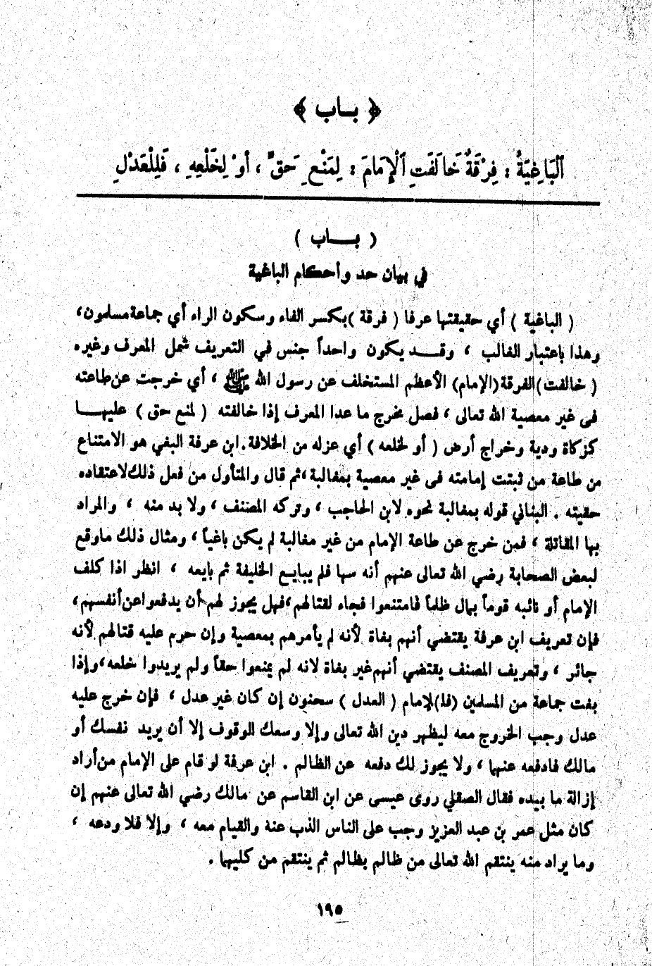(بَابٌ) الْبَاغِيَةُ: فِرْقَةٌ خَالَفَتْ الْإِمَامَ: لِمَنْعِ حَقٍّ، أَوْ لِخَلْعِهِ، فَلِلْعَدْلِ