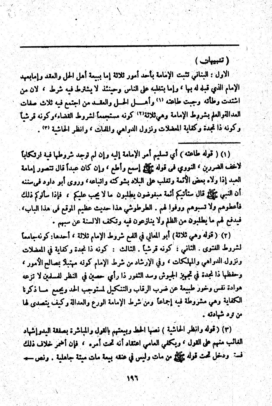 ـــــــــــــــــــــــــــــQتَنْبِيهَانِ) الْأَوَّلُ: الْبُنَانِيُّ تَثْبُتُ الْإِمَامَةُ بِأَحَدِ أُمُورٍ ثَلَاثَةٍ إمَّا بِبَيْعَةِ أَهْلِ الْحَلِّ وَالْعَقْدِ وَإِمَّا بِعَهْدِ الْإِمَامِ الَّذِي قَبْلَهُ لَهُ بِهَا، وَإِمَّا بِتَغَلُّبِهِ عَلَى النَّاسِ وَحِينَئِذٍ لَا يُشْتَرَطُ فِيهِ شَرْطٌ لِأَنَّ مَنْ اشْتَدَّتْ وَطْأَتُهُ وَجَبَتْ طَاعَتُهُ وَأَهْلُ الْحَلِّ وَالْعَقْدِ مَنْ اجْتَمَعَ فِيهِ ثَلَاثُ صِفَاتٍ الْعَدَالَةُ وَالْعِلْمُ بِشُرُوطِ الْإِمَامَةِ وَهِيَ ثَلَاثَةٌ كَوْنُهُ مُسْتَجْمِعًا لِشُرُوطِ الْقَضَاءِ، وَكَوْنُهُ قُرَشِيًّا وَكَوْنُهُ ذَا نَجْدَةٍ وَكِفَايَةِ الْمُعْضِلَاتِ وَنُزُولِ الدَّوَاهِي وَالْمُلِمَّاتِ، وَانْظُرْ الْحَاشِيَةَ.