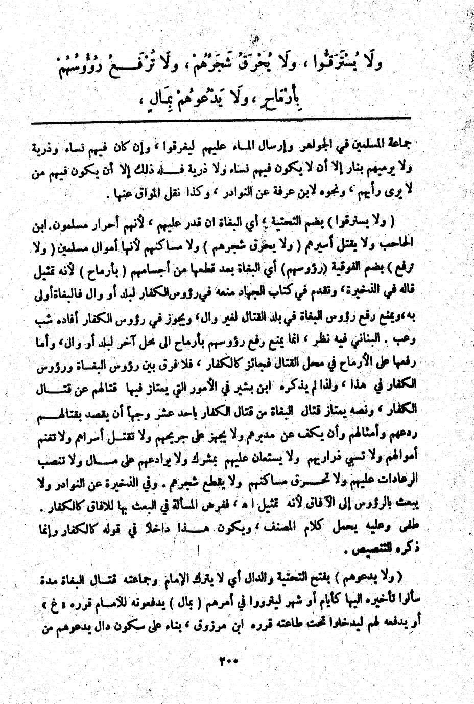 وَلَا يُسْتَرَقُّوا، وَلَا يُحْرَقُ شَجَرُهُمْ، وَلَا تُرْفَعُ رُءُوسُهُمْ بِأَرْمَاحٍ