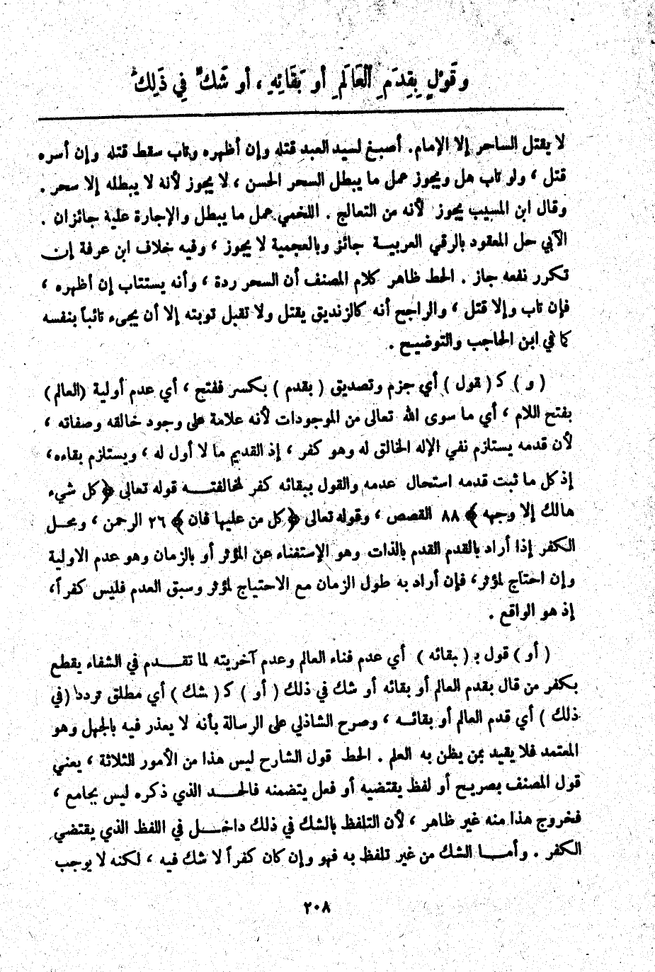 وَقَوْلٍ بِقِدَمِ الْعَالَمِ أَوْ بَقَائِهِ، أَوْ شَكٍّ فِي ذَلِكَ