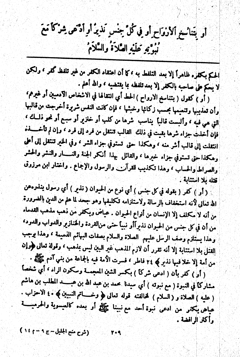 أَوْ بِتَنَاسُخِ الْأَرْوَاحِ أَوْ فِي كُلِّ جِنْسٍ نَذِيرٌ أَوْ ادَّعَى شِرْكًا مَعَ نُبُوَّتِهِ - عَلَيْهِ الصَّلَاةُ وَالسَّلَامُ -