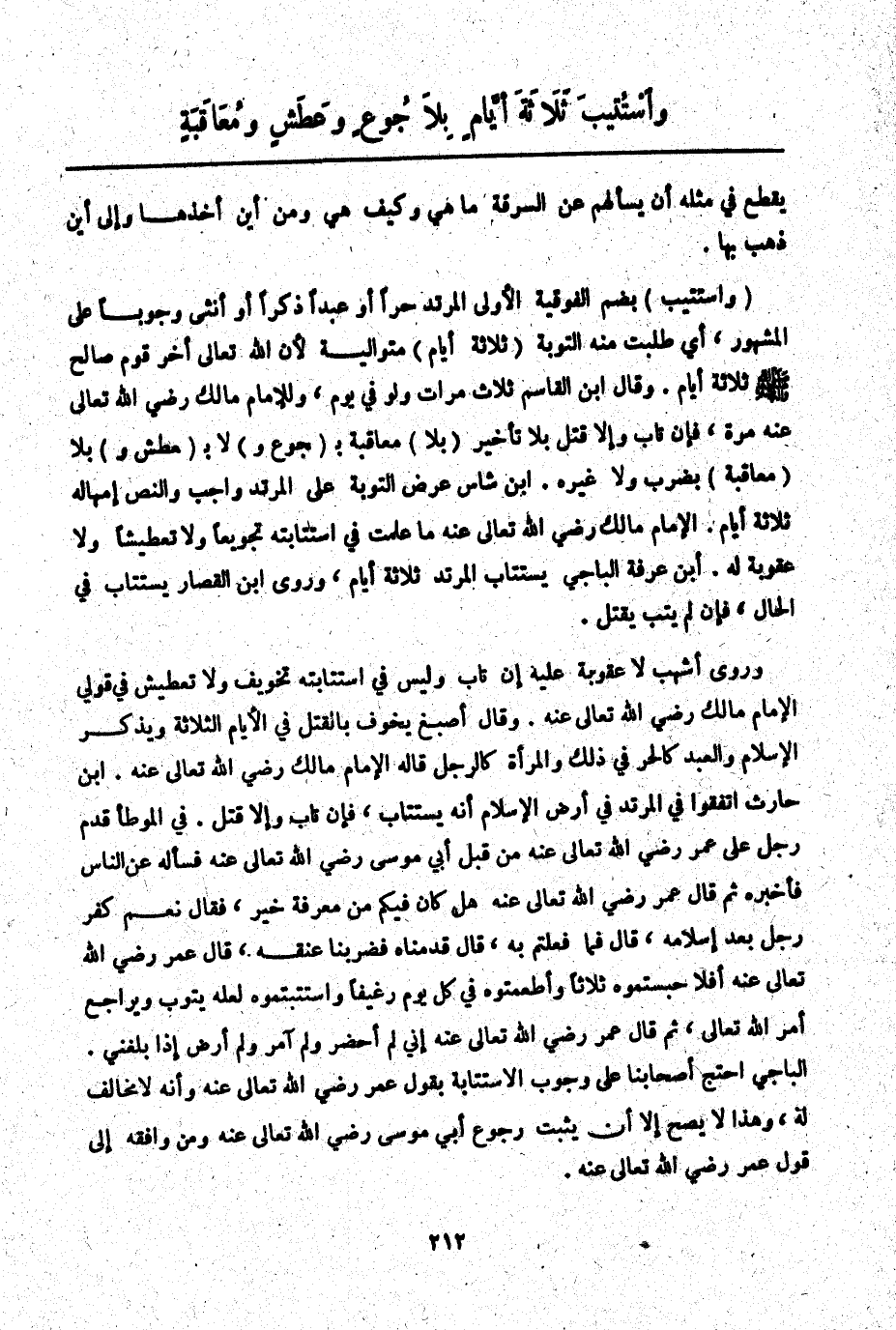 الْبَاجِيَّ احْتَجَّ أَصْحَابُنَا عَلَى وُجُوبِ الِاسْتِتَابَةِ بِقَوْلِ عُمَرَ - رَضِيَ اللَّهُ عَنْهُ - وَأَنَّهُ لَا مُخَالِفَ لَهُ، وَهَذَا لَا يَصِحُّ إلَّا أَنْ يَثْبُتَ رُجُوعُ أَبِي مُوسَى - رَضِيَ اللَّهُ عَنْهُ - وَمَنْ وَافَقَهُ إلَى قَوْلِ عُمَرَ - رَضِيَ اللَّهُ عَنْهُ -.