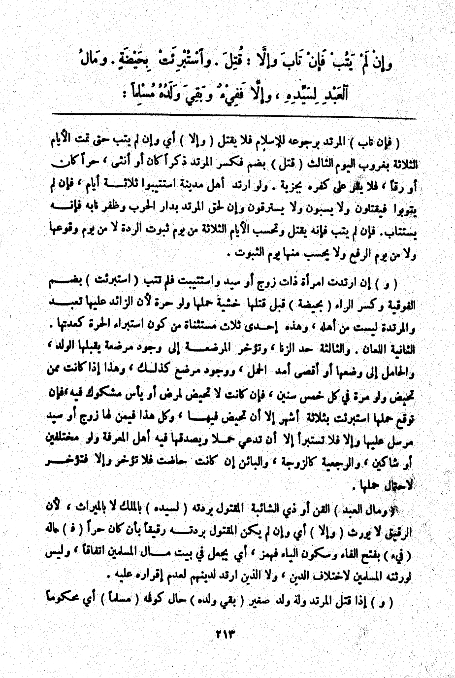 (وَ) إنْ ارْتَدَّتْ امْرَأَةٌ ذَاتُ زَوْجٍ أَوْ سَيِّدٍ وَاسْتُتِيبَتْ فَلَمْ تَتُبْ (اُسْتُبْرِئَتْ) بِضَمِّ الْفَوْقِيَّةِ وَكَسْرِ الرَّاءِ (بِحَيْضَةٍ) قَبْلَ قَتْلِهَا خَشْيَةَ حَمْلِهَا وَلَوْ حُرَّةً لِأَنَّ الزَّائِدَ عَلَيْهَا تَعَبُّدٌ، وَالْمُرْتَدَّةُ لَيْسَتْ مِنْ أَهْلِهِ، وَهَذِهِ إحْدَى ثَلَاثٍ مُسْتَثْنَاةٍ مِنْ كَوْنِ اسْتِبْرَاءِ الْحُرَّةِ كَعِدَّتِهَا.