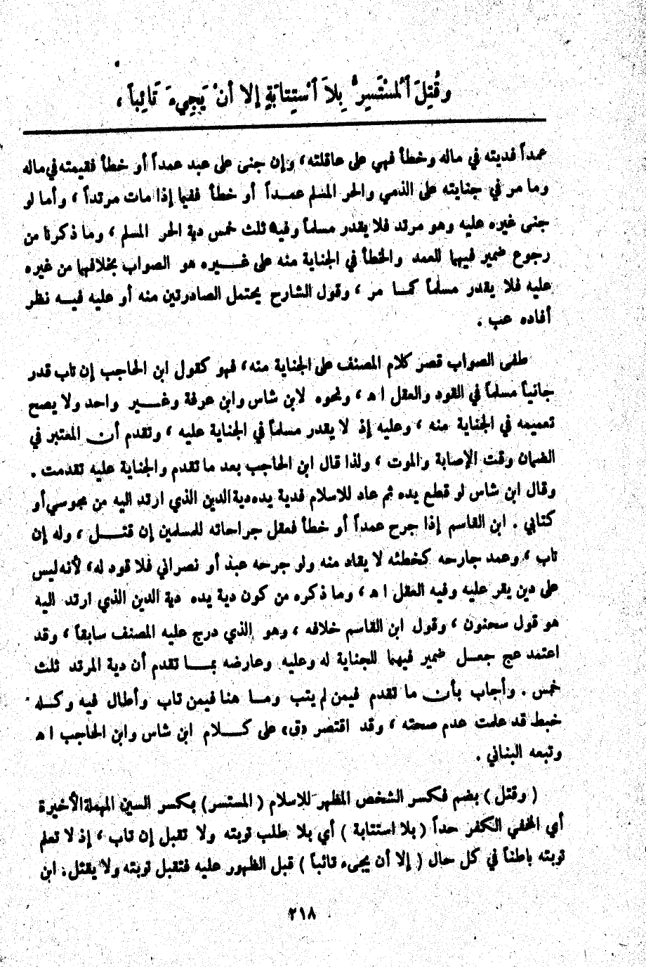 طفي الصَّوَابُ قَصْرُ كَلَامِ الْمُصَنِّفِ عَلَى الْجِنَايَةِ مِنْهُ، فَهُوَ كَقَوْلِ ابْنِ الْحَاجِبِ إنْ تَابَ قُدِّرَ جَانِيًا مُسْلِمًا فِي الْقَوَدِ وَالْعَقْلِ. اهـ. وَنَحْوُهُ لِابْنِ شَاسٍ وَابْنِ عَرَفَةَ وَغَيْرِ وَاحِدٍ وَلَا يَصِحُّ تَعْمِيمُهُ فِي الْجِنَايَةِ مِنْهُ، وَعَلَيْهِ إذْ لَا يُقَدَّرُ مُسْلِمًا فِي الْجِنَايَةِ عَلَيْهِ، وَتَقَدَّمَ أَنَّ الْمُعْتَبَرَ فِي الضَّمَانِ وَقْتُ الْإِصَابَةِ وَالْمَوْتِ، وَلِذَا قَالَ ابْنُ الْحَاجِبِ بَعْدَ مَا تَقَدَّمَ وَالْجِنَايَةُ عَلَيْهِ تَقَدَّمَتْ.