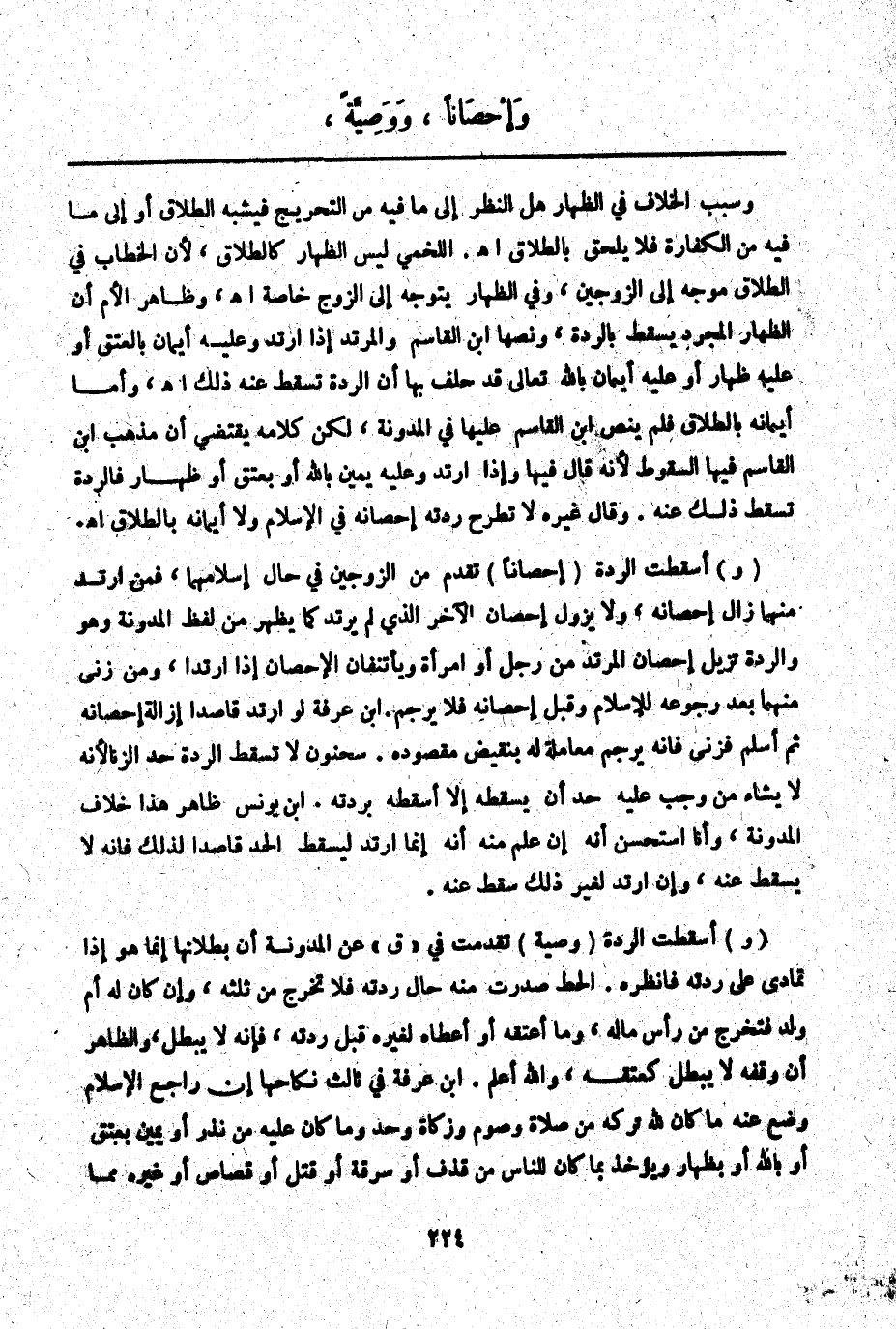 (وَ) أَسْقَطَتْ الرِّدَّةُ (وَصِيَّةً) تَقَدَّمَتْ فِي " ق " عَنْ الْمُدَوَّنَةِ أَنَّ بُطْلَانَهَا إنَّمَا هُوَ إذَا تَمَادَى عَلَى رِدَّتِهِ فَانْظُرْهُ. الْحَطّ صَدَرَتْ مِنْهُ حَالَ رِدَّتِهِ فَلَا تَخْرُجُ مِنْ ثُلُثِهِ، وَإِنْ كَانَ لَهُ أُمُّ وَلَدٍ فَتَخْرُجُ مِنْ رَأْسِ مَالِهِ، وَمَا أَعْتَقَهُ أَوْ أَعْطَاهُ لِغَيْرِهِ قَبْلَ رِدَّتِهِ، فَإِنَّهُ لَا يَبْطُلُ وَالظَّاهِرُ أَنَّ وَقْفَهُ لَا يَبْطُلُ كَعِتْقِهِ، وَاَللَّهُ أَعْلَمُ. ابْنُ عَرَفَةَ فِي ثَالِثِ نِكَاحِهَا إنْ رَاجَعَ الْإِسْلَامَ وُضِعَ عَنْهُ مَا كَانَ لِلَّهِ تَرَكَهُ مِنْ صَلَاةٍ وَصَوْمٍ وَزَكَاةٍ وَحَدٍّ وَمَا كَانَ عَلَيْهِ مِنْ نَذْرٍ أَوْ يَمِينٍ بِعِتْقٍ أَوْ بِاَللَّهِ أَوْ بِظِهَارٍ وَيُؤْخَذُ بِمَا كَانَ لِلنَّاسِ مِنْ قَذْفٍ أَوْ سَرِقَةٍ أَوْ قَتْلٍ أَوْ قِصَاصٍ أَوْ غَيْرِهِ مِمَّا
