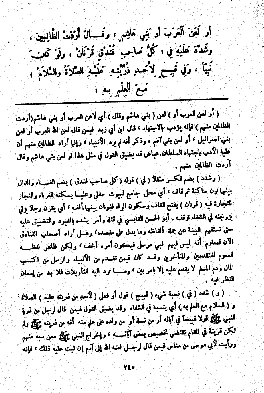 ـــــــــــــــــــــــــــــQأَوْ لَعَنَ الْعَرَبَ أَوْ) لَعَنَ (بَنِي هَاشِمٍ وَقَالَ) أَيْ لَاعِنُ الْعَرَبِ أَوْ بَنِي هَاشِمٍ (أَرَدْت الظَّالِمِينَ مِنْهُمْ) فَإِنَّهُ يُؤَدَّبُ بِالِاجْتِهَادِ، قَالَ ابْنُ أَبِي زَيْدٍ فِيمَنْ قَالَ لَعَنَ اللَّهُ الْعَرَبَ أَوْ لَعَنَ بَنِي إسْرَائِيلَ، أَوْ لَعَنَ بَنِي آدَمَ، وَذَكَرَ أَنَّهُ لَمْ يُرِدْ الْأَنْبِيَاءَ، وَإِنَّمَا أَرَادَ الظَّالِمِينَ مِنْهُمْ أَنَّ عَلَيْهِ الْأَدَبَ بِاجْتِهَادِ السُّلْطَانِ. عِيَاضٌ قَدْ يُضَيَّقُ الْقَوْلُ فِي مِثْلِ هَذَا لَوْ لَعَنَ بَنِي هَاشِمٍ وَقَالَ أَرَدْت الظَّالِمِينَ مِنْهُمْ.