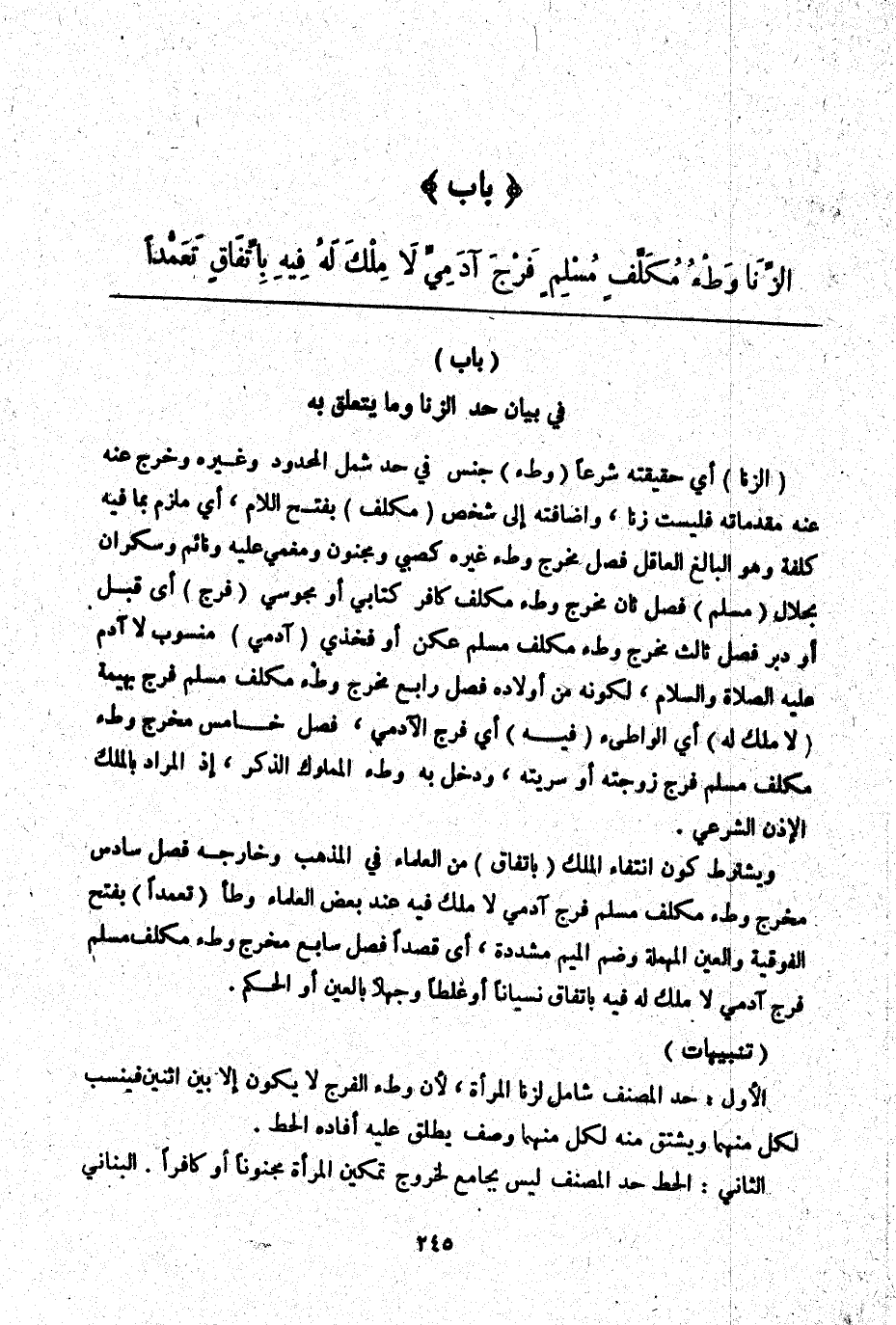 (بَابٌ) الزِّنَا وَطْءُ مُكَلَّفٍ مُسْلِمٍ فَرْجَ آدَمِيٍّ لَا مِلْكَ لَهُ فِيهِ بِاتِّفَاقٍ تَعَمُّدًا