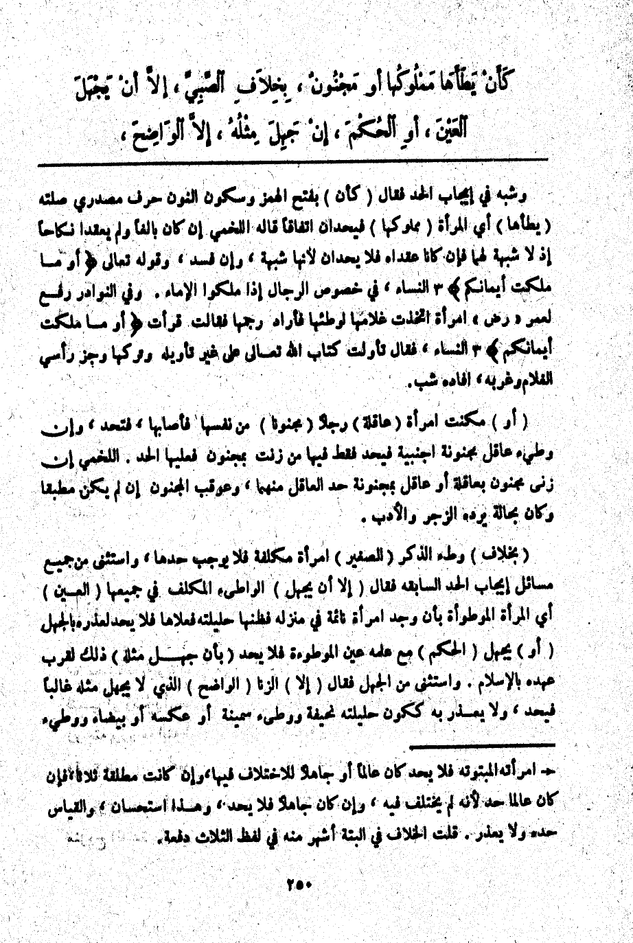 ـــــــــــــــــــــــــــــQوَشَبَّهَ فِي إيجَابِ الْحَدِّ فَقَالَ (كَأَنْ) بِفَتْحِ الْهَمْزِ وَسُكُونِ النُّونِ حَرْفٌ مَصْدَرِيٌّ صِلَتُهُ (يَطَأَهَا) أَيْ الْمَرْأَةَ (مَمْلُوكُهَا) فَيُحَدَّانِ اتِّفَاقًا قَالَهُ اللَّخْمِيُّ إنْ كَانَ بَالِغًا وَلَمْ يَعْقِدَا نِكَاحًا إذْ لَا شُبْهَةَ لَهُمَا فَإِنْ كَانَا عَقَدَاهُ فَلَا يُحَدَّانِ لِأَنَّهَا شُبْهَةٌ، وَإِنْ فَسَدَ وقَوْله تَعَالَى {أَوْ مَا مَلَكَتْ أَيْمَانُكُمْ} [النساء: 3] النِّسَاءَ، فِي خُصُوصِ الرِّجَالِ إذَا مَلَكُوا الْإِمَاءَ. وَفِي النَّوَادِرِ رُفِعَ لِعُمَرَ " - رَضِيَ اللَّهُ عَنْهُ - " امْرَأَةٌ اتَّخَذَتْ غُلَامَهَا لِوَطْئِهَا فَأَرَادَ رَجْمَهَا فَقَالَتْ قَرَأْت {أَوْ مَا مَلَكَتْ أَيْمَانُكُمْ} [النساء: 3] النِّسَاءَ، فَقَالَ تَأَوَّلْتِ كِتَابَ اللَّهِ تَعَالَى عَلَى غَيْرِ تَأْوِيلِهِ وَتَرَكَهَا وَجَزَّ رَأْسَ الْغُلَامِ وَغَرَّبَهُ، أَفَادَهُ شب.