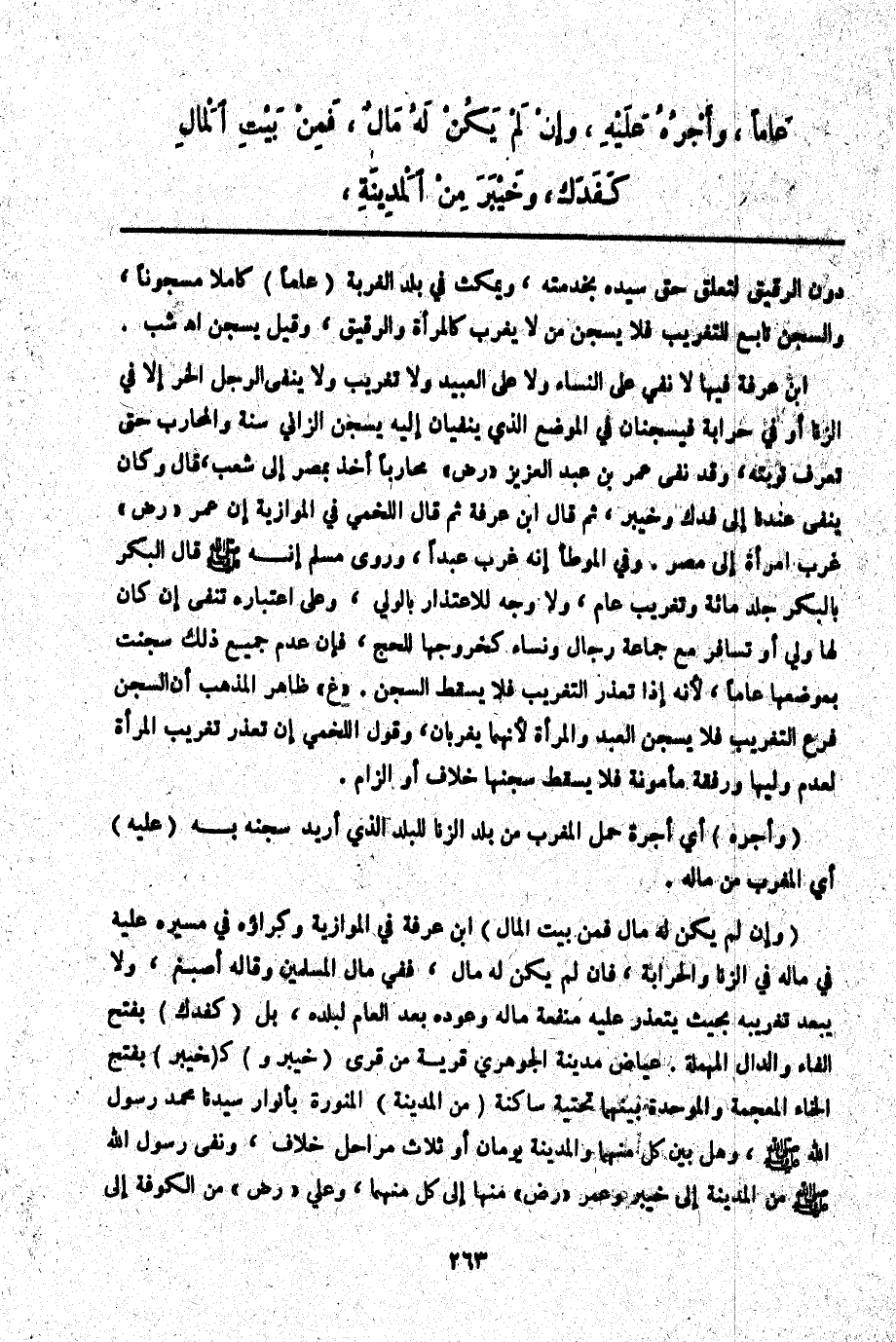 عَامًا، وَأَجْرُهُ عَلَيْهِ، وَإِنْ لَمْ يَكُنْ لَهُ مَالٌ، فَمِنْ بَيْتِ الْمَالِ كَفَدَكَ وَخَيْبَرَ مِنْ الْمَدِينَةِ،
