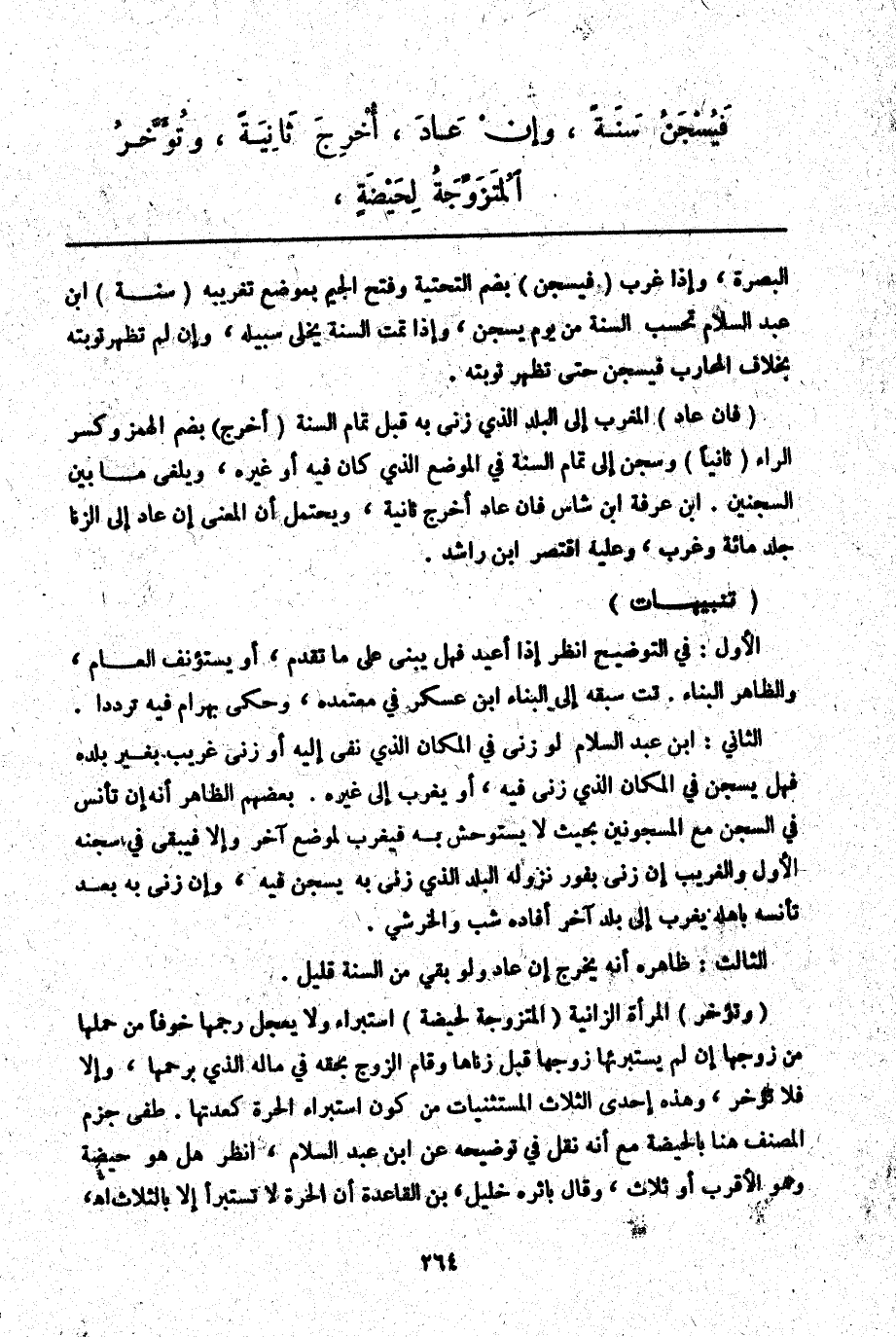 فَيُسْجَنُ سَنَةً، وَإِنْ عَادَ، أُخْرِجَ ثَانِيَةً، وَتُؤَخَّرُ الْمُتَزَوِّجَةُ لِحَيْضَةٍ،