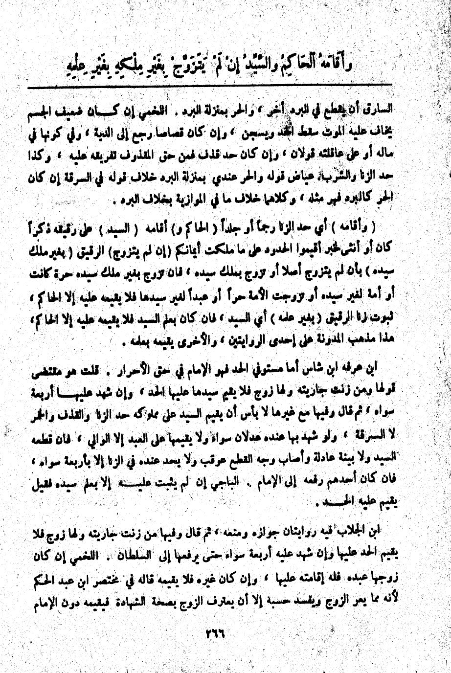 ابْنُ الْجَلَّابِ فِيهِ رِوَايَتَانِ جَوَازُهُ وَمَنْعُهُ، ثُمَّ قَالَ وَفِيهَا مَنْ زَنَتْ جَارِيَتُهُ وَلَهَا زَوْجٌ فَلَا يُقِيمُ الْحَدَّ عَلَيْهَا وَإِنْ شَهِدَ عَلَيْهِ أَرْبَعَةٌ سِوَاهُ حَتَّى يَرْفَعَهَا إلَى السُّلْطَانِ. اللَّخْمِيُّ إنْ كَانَ زَوْجُهَا عَبْدَهُ فَلَهُ إقَامَتُهُ عَلَيْهَا، وَإِنْ كَانَ غَيْرَهُ فَلَا يُقِيمُهُ قَالَهُ فِي مُخْتَصَرِ ابْنِ عَبْدِ الْحَكَمِ لِأَنَّهُ مِمَّا يَعِرُّ الزَّوْجَ وَيُفْسِدُ حَسَبَهُ إلَّا أَنْ يَعْتَرِفَ الزَّوْجُ بِصِحَّةِ الشَّهَادَةِ فَيُقِيمُهُ دُونَ الْإِمَامِ