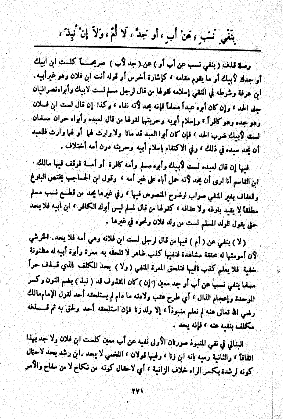 ابْنُ عَرَفَةَ وَشَرْطُهُ فِي الْمَنْفِيِّ إسْلَامُهُ لِقَوْلِهَا مَنْ قَالَ لِرَجُلٍ مُسْلِمٍ لَسْت لِأَبِيكَ وَأَبَوَاهُ نَصْرَانِيَّانِ جُلِدَ الْحَدَّ، وَإِنْ كَانَ أَبُوهُ عَبْدًا مُسْلِمًا فَإِنَّهُ يُحَدُّ لِأَنَّهُ نَفَاهُ، وَكَذَا إنْ قَالَ لَسْت ابْنَ فُلَانٍ وَهُوَ جَدُّهُ وَهُوَ كَافِرٌ، وَإِسْلَامُ أَبَوَيْهِ وَحُرِّيَّتُهُمَا لِقَوْلِهَا مَنْ قَالَ لِعَبْدِهِ وَأَبَوَاهُ حُرَّانِ مُسْلِمَانِ لَسْت لِأَبِيك ضُرِبَ الْحَدَّ، فَإِنْ كَانَ أَبَوَا الْعَبْدِ قَدْ مَاتَا وَلَا وَارِثَ لَهُمَا أَوْ لَهُمَا وَارِثٌ فَلِلْعَبْدِ أَنْ يَحُدَّ سَيِّدَهُ فِي ذَلِكَ، وَفِي الِاكْتِفَاءِ بِإِسْلَامِ أَبِيهِ وَحُرِّيَّتِهِ دُونَ أُمِّهِ اخْتِلَافٌ.