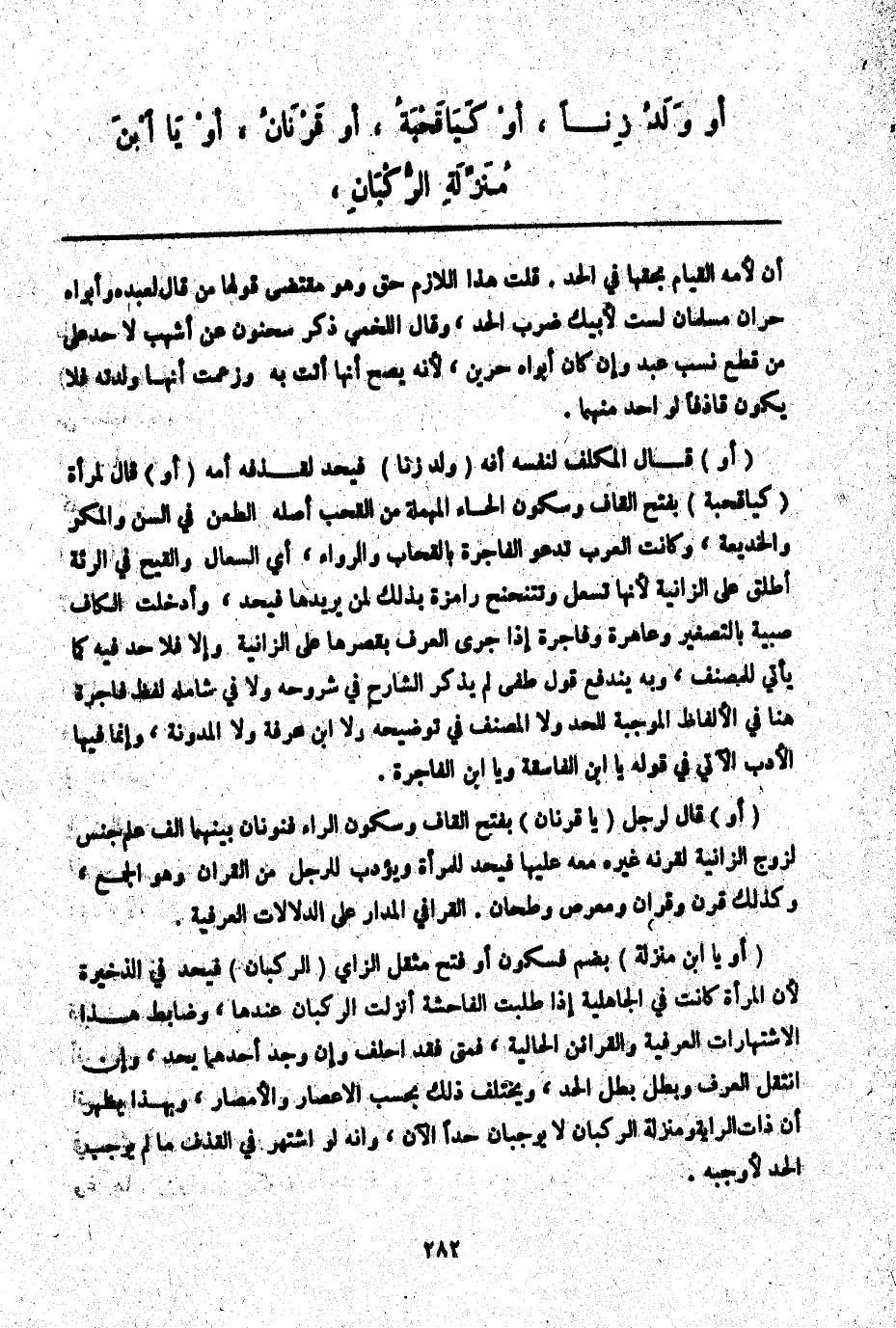 (أَوْ يَا ابْنَ مُنْزِلَةِ) بِضَمٍّ فَسُكُونٍ أَوْ فَتْحِ مُثَقَّلِ الزَّايِ (الرُّكْبَانِ) فَيُحَدُّ فِي الذَّخِيرَةِ لِأَنَّ الْمَرْأَةَ كَانَتْ فِي الْجَاهِلِيَّةِ إذَا طَلَبَتْ الْفَاحِشَةَ أَنْزَلَتْ الرُّكْبَانَ عِنْدَهَا، وَضَابِطُ هَذَا الِاشْتِهَارَاتُ الْعُرْفِيَّةُ وَالْقَرَائِنُ الْحَالِيَّةُ، فَمَتَى فُقِدَ أُحْلِفَ وَإِنْ وُجِدَ أَحَدُهُمَا يُحَدُّ، وَإِنْ انْتَقَلَ الْعُرْفُ وَبَطَلَ بَطَلَ الْحَدُّ، وَيَخْتَلِفُ ذَلِكَ بِحَسَبِ الْأَعْصَارِ وَالْأَمْصَارِ، وَبِهَذَا يَظْهَرُ أَنَّ ذَاتَ الرَّايَةِ وَمُنْزِلَةَ الرُّكْبَانِ لَا يُوجِبَانِ حَدًّا الْآنَ، وَأَنَّهُ لَوْ اُشْتُهِرَ فِي الْقَذْفِ مَا لَمْ يُوجِبْ الْحَدَّ لَأَوْجَبَهُ.
