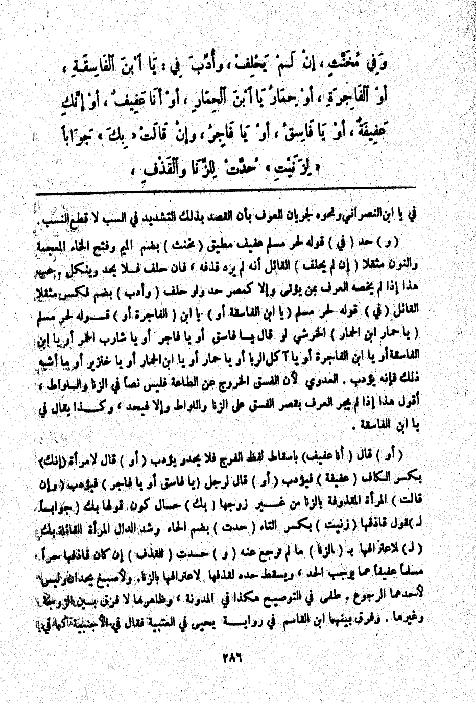 (وَ) حُدَّ (فِي) قَوْلِهِ لِحُرٍّ مُسْلِمٍ عَفِيفٍ مُطِيقٍ (مُخَنَّثٍ) بِضَمِّ الْمِيمِ وَفَتْحِ الْخَاءِ الْمُعْجَمَةِ وَالنُّونِ مُثَقَّلًا (إنْ لَمْ يَحْلِفْ) الْقَائِلُ أَنَّهُ لَمْ يُرِدْ قَذْفَهُ، فَإِنْ حَلَفَ فَلَا يُحَدُّ وَيُنَكَّلُ. عب هَذَا إذَا لَمْ يَخُصَّهُ الْعُرْفُ بِمَنْ يُؤْتَى وَإِلَّا كَمُصِرٍّ حُدَّ وَلَوْ حَلَفَ (وَأُدِّبَ) بِضَمٍّ فَكَسْرٍ مُثَقَّلًا الْقَائِلُ (فِي) قَوْلِهِ لِحُرٍّ مُسْلِمٍ (يَا ابْنَ الْفَاسِقَةِ أَوْ) يَا ابْنَ (الْفَاجِرَةِ أَوْ) قَوْلِهِ لِحُرٍّ مُسْلِمٍ (يَا حِمَارُ يَا ابْنَ الْحِمَارِ) الْخَرَشِيُّ لَوْ قَالَ يَا فَاسِقُ أَوْ يَا فَاجِرُ أَوْ يَا شَارِبَ الْخَمْرِ أَوْ يَا ابْنَ الْفَاسِقَةِ أَوْ يَا ابْنَ الْفَاجِرَةِ أَوْ يَا آكِلَ الرِّبَا أَوْ يَا حِمَارُ أَوْ يَا ابْنَ الْحِمَارِ أَوْ يَا خِنْزِيرُ أَوْ مَا أَشْبَهَ ذَلِكَ فَإِنَّهُ يُؤَدَّبُ. الْعَدَوِيُّ لِأَنَّ الْفِسْقَ الْخُرُوجُ عَنْ الطَّاعَةِ فَلَيْسَ نَصًّا فِي الزِّنَا وَاللِّوَاطِ أَقُولُ هَذَا إذَا لَمْ يَجْرِ الْعُرْفُ بِقَصْرِ الْفِسْقِ عَلَى الزِّنَا وَاللِّوَاطِ وَإِلَّا فَيُحَدُّ، وَكَذَا يُقَالُ فِي يَا ابْنَ الْفَاسِقَةِ.
