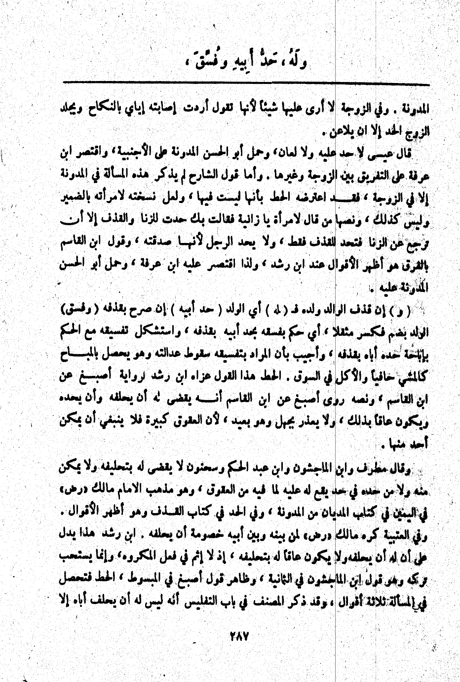 (وَ) إنْ قَذَفَ الْوَالِدُ وَلَدَهُ فَ (لَهُ) أَيْ الْوَلَدِ (حَدُّ أَبِيهِ) إنْ صَرَّحَ بِقَذْفِهِ (وَفُسِّقَ) الْوَلَدُ بِضَمٍّ فَكَسْرٍ مُثَقَّلًا، أَيْ حُكِمَ بِفِسْقِهِ بِحَدِّ أَبِيهِ بِقَذْفِهِ، وَاسْتُشْكِلَ تَفْسِيقُهُ مَعَ الْحُكْمِ بِإِبَاحَةِ حَدِّهِ أَبَاهُ بِقَذْفِهِ، وَأُجِيبَ بِأَنَّ الْمُرَادَ بِتَفْسِيقِهِ سُقُوطُ عَدَالَتِهِ وَهُوَ يَحْصُلُ بِالْمُبَاحِ كَالْمَشْيِ حَافِيًا وَالْأَكْلِ فِي السُّوقِ. الْحَطّ هَذَا الْقَوْلُ عَزَاهُ ابْنُ رُشْدٍ لِرِوَايَةِ أَصْبَغَ عَنْ ابْنِ الْقَاسِمِ، وَنَصُّهُ رَوَى أَصْبَغُ عَنْ ابْنِ الْقَاسِمِ أَنَّهُ يُقْضَى لَهُ أَنْ يُحَلِّفَهُ وَأَنْ يَحُدَّهُ وَيَكُونُ عَاقًّا بِذَلِكَ، وَلَا يُعْذَرُ بِجَهْلٍ وَهُوَ بَعِيدٌ لِأَنَّ الْعُقُوقَ كَبِيرَةٌ فَلَا يَنْبَغِي أَنْ يُمَكَّنَ أَحَدٌ مِنْهَا.