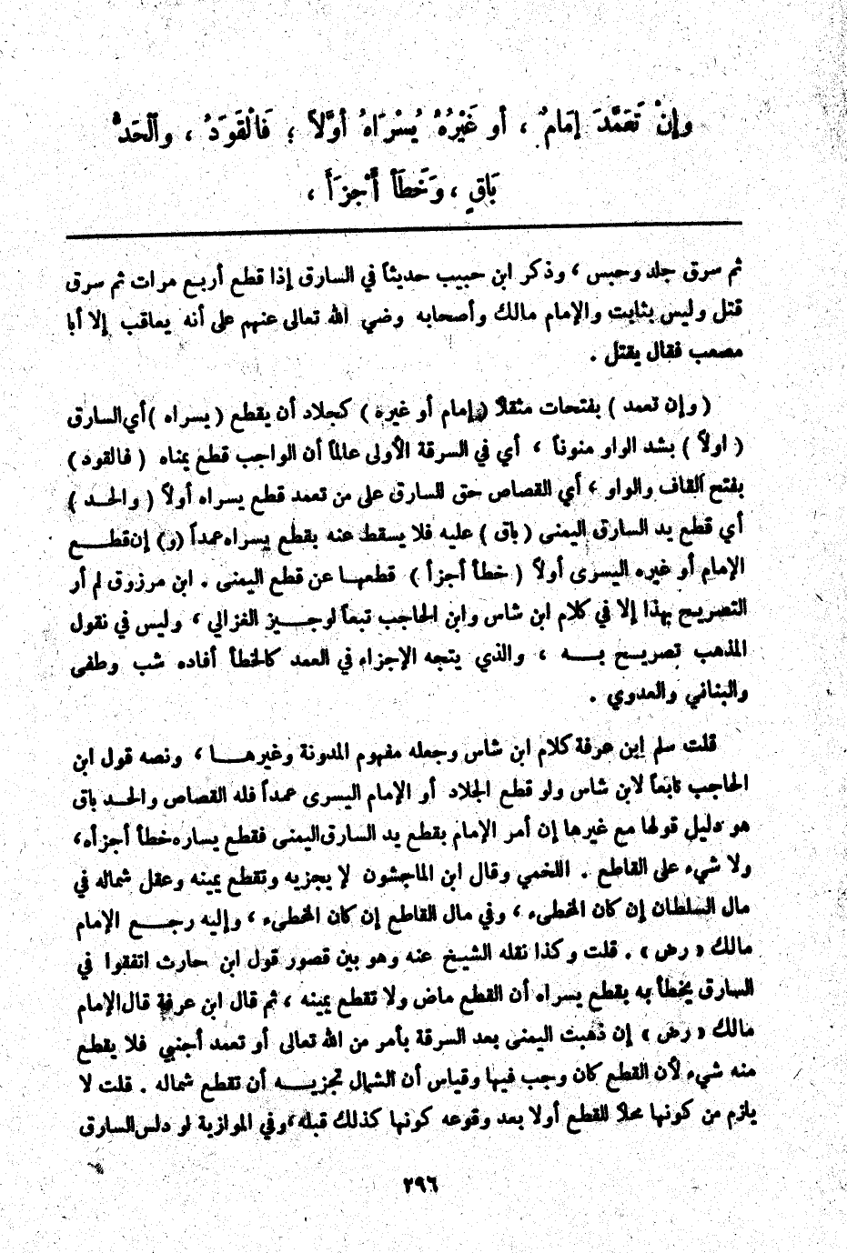 (وَإِنْ تَعَمَّدَ) بِفَتَحَاتٍ مُثَقَّلًا (إمَامٌ أَوْ غَيْرُهُ) كَجَلَّادٍ أَنْ يَقْطَعَ (يُسْرَاهُ) أَيْ السَّارِقِ (أَوَّلًا) بِشَدِّ الْوَاوِ مُنَوَّنًا، أَيْ فِي السَّرِقَةِ الْأُولَى عَالِمًا أَنَّ الْوَاجِبَ قَطْعُ يُمْنَاهُ (فَالْقَوَدُ) بِفَتْحِ الْقَافِ وَالْوَاوِ، أَيْ الْقِصَاصُ حَقٌّ لِلسَّارِقِ عَلَى مَنْ تَعَمَّدَ قَطْعَ يُسْرَاهُ أَوَّلًا (وَالْحَدُّ) أَيْ قَطْعُ يَدِ السَّارِقِ الْيُمْنَى (بَاقٍ) عَلَيْهِ فَلَا يَسْقُطُ عَنْهُ بِقَطْعِ يُسْرَاهُ عَمْدًا (وَ) إنْ قَطَعَ الْإِمَامُ أَوْ غَيْرُهُ الْيُسْرَى أَوَّلًا (خَطَأً أَجْزَأَ) قَطْعُهَا عَنْ قَطْعِ الْيُمْنَى. ابْنُ مَرْزُوقٍ لَمْ أَرَ التَّصْرِيحَ بِهَذَا إلَّا فِي كَلَامِ ابْنِ شَاسٍ وَابْنِ الْحَاجِبِ تَبَعًا لِوَجِيزِ الْغَزَالِيِّ، وَلَيْسَ فِي نُقُولِ الْمَذْهَبِ تَصْرِيحٌ بِهِ، وَاَلَّذِي يُتَّجَهُ الْإِجْزَاءُ فِي الْعَمْدِ كَالْخَطَأِ أَفَادَهُ شب وطفي وَالْبَنَّانِيُّ وَالْعَدَوِيُّ.