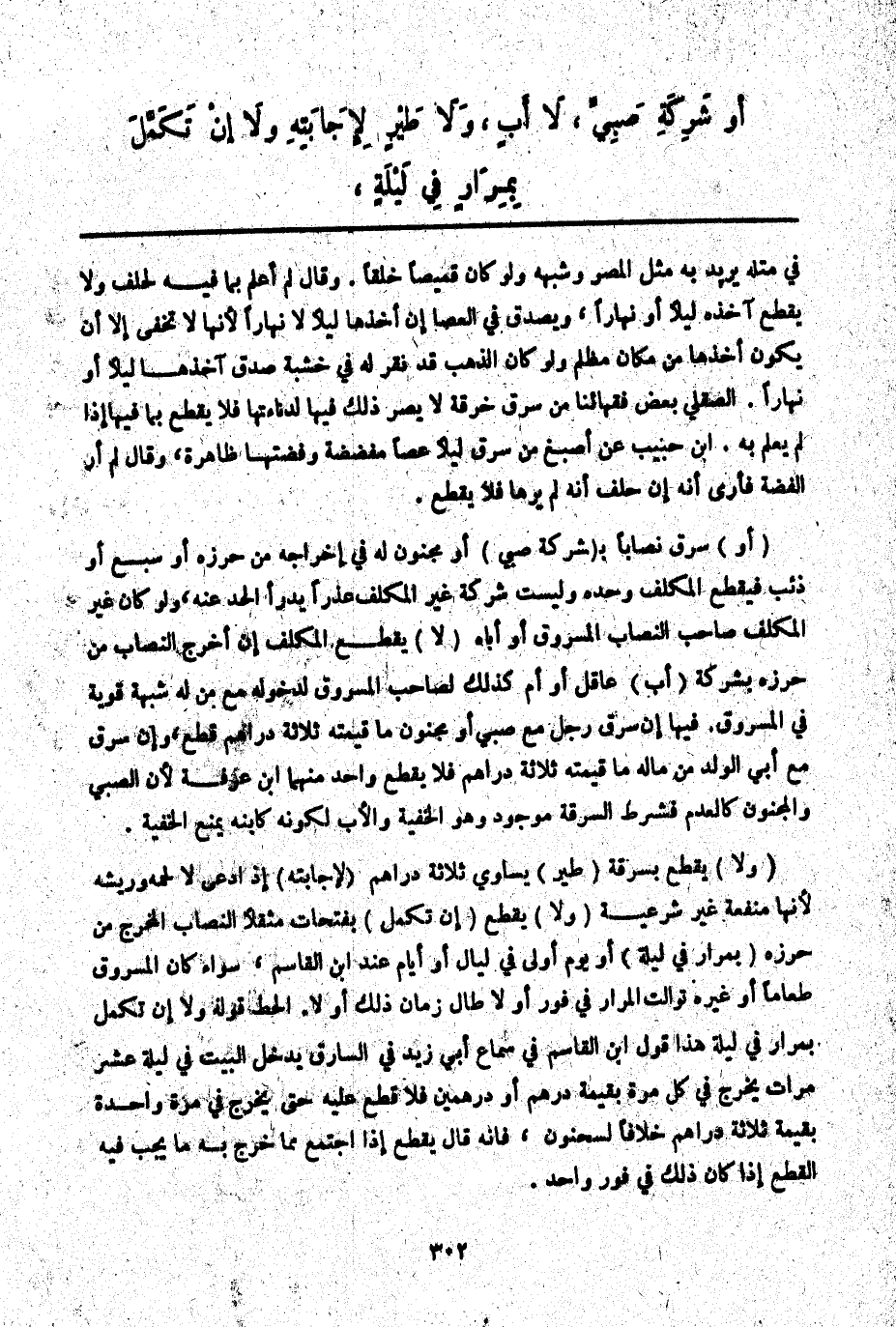 أَوْ سَرَقَ نِصَابًا بِ (شَرِكَةِ صَبِيٍّ) أَوْ مَجْنُونٍ لَهُ فِي إخْرَاجِهِ مِنْ حِرْزِهِ أَوْ سَبُعٍ أَوْ ذِئْبٍ فَيُقْطَعُ الْمُكَلَّفُ وَحْدَهُ وَلَيْسَتْ شَرِكَةُ غَيْرِ الْمُكَلَّفِ عُذْرًا يَدْرَأُ الْحَدَّ عَنْهُ، وَلَوْ كَانَ غَيْرَ الْمُكَلَّفِ صَاحِبَ النِّصَابِ الْمَسْرُوقِ أَوْ أَبَاهُ (لَا) يُقْطَعُ الْمُكَلَّفُ إنْ أَخْرَجَ النِّصَابَ مِنْ حِرْزِهِ بِشَرِكَةِ (أَبٍ) عَاقِلٍ أَوْ أُمٍّ كَذَلِكَ لِصَاحِبِ الْمَسْرُوقِ لِدُخُولِهِ مَعَ مَنْ لَهُ شُبْهَةٌ قَوِيَّةٌ فِي الْمَسْرُوقِ. فِيهَا إنْ سَرَقَ رَجُلٌ مَعَ صَبِيٍّ أَوْ مَجْنُونٍ مَا قِيمَتُهُ ثَلَاثَةُ دَرَاهِمَ قُطِعَ، وَإِنْ سَرَقَ مَعَ أَبِي الْوَلَدِ مِنْ مَالِهِ مَا قِيمَتُهُ ثَلَاثَةَ دَرَاهِمَ فَلَا يُقْطَعُ وَاحِدٌ مِنْهُمَا ابْنُ عَرَفَةَ لِأَنَّ الصَّبِيَّ وَالْمَجْنُونَ كَالْعَدَمِ فَشَرْطُ السَّرِقَةِ مَوْجُودٌ وَهُوَ الْخُفْيَةُ وَالْأَبُ لِكَوْنِهِ كَابْنِهِ يَمْنَعُ الْخُفْيَةَ.