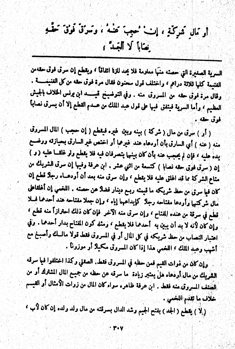 (أَوْ) سَرَقَ مِنْ مَالِ (شَرِكَةٍ) بَيْنَهُ وَبَيْنَ غَيْرِهِ فَيُقْطَعُ (إنْ حُجِبَ) الْمَالُ الْمَسْرُوقُ مِنْهُ (عَنْهُ) أَيْ السَّارِقِ بِأَنْ أَوْدَعَاهُ عِنْدَ غَيْرِهِمَا أَوْ اخْتَصَّ غَيْرُ السَّارِقِ بِحِيَازَتِهِ وَوَضَعَ يَدَهُ عَلَيْهِ، فَإِنْ لَمْ يُحْجَبْ عَنْهُ بِأَنْ كَانَ بَيْنَهُمَا يَتَصَرَّفَانِ فِيهِ فَلَا يُقْطَعُ وَلَوْ غَلَقَا عَلَيْهِ (وَ) إنْ (سَرَقَ فَوْقَ حَقِّهِ نِصَابًا) كَتِسْعَةٍ مِنْ اثْنَيْ عَشْرَ. ابْنُ عَرَفَةَ وَفِيهَا إنْ سَرَقَ الشَّرِيكُ مِنْ مَتَاعِ الشَّرِكَةِ مِمَّا قَدْ أَغْلَقَ عَلَيْهِ فَلَا يُقْطَعُ، وَإِنْ سَرَقَ مِنْهُ بَعْدَ أَنْ أَوْدَعَاهُ رَجُلًا قُطِعَ إنْ كَانَ فِيمَا سَرَقَ مِنْ حَظِّ شَرِيكِهِ مَا قِيمَتُهُ رُبُعُ دِينَارٍ فَضْلًا عَنْ حِصَّتِهِ. اللَّخْمِيُّ إنْ أَغْلَقَا عَلَى مَالِ شَرِكَتِهِمَا وَأَوْدَعَا مِفْتَاحَهُ رَجُلًا كَإِيدَاعِهِمَا إيَّاهُ، وَإِنْ حَمَلَا مِفْتَاحَهُ عِنْدَ أَحَدِهِمَا فَلَا قَطْعَ فِي سَرِقَةِ مَنْ عِنْدَهُ الْمِفْتَاحُ، وَإِنْ سَرَقَ مِنْهُ الْآخَرُ فَإِنْ كَانَ ذَلِكَ احْتِرَازًا مِنْهُ قُطِعَ، وَإِنْ كَانَ لِأَنَّهُ لَا بُدَّ أَنْ يُبَيِّنَ بِهِ أَحَدَهُمَا فَلَا يُقْطَعُ، وَمِثْلُهُ كَوْنُ الْمِفْتَاحِ بِدَارِ أَحَدِهِمَا. وَفِي اعْتِبَارِ النِّصَابِ مِنْ حَظِّ شَرِيكِهِ فِي الْمَالِ أَوْ فِي الْمَسْرُوقِ فَقَطْ قَوْلَا مَالِكٍ وَأَصْبَغَ مَعَ أَشْهَبَ وَعَبْدِ الْمَلِكِ اللَّخْمِيُّ هَذَا إذَا كَانَ الْمَسْرُوقُ مَكِيلًا أَوْ مَوْزُونًا.