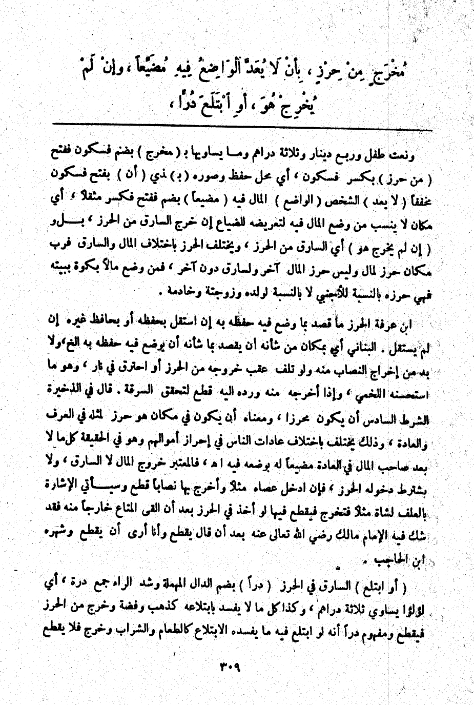 ـــــــــــــــــــــــــــــQوَنَعْتُ طِفْلٍ وَرُبُعِ دِينَارٍ وَثَلَاثَةِ دَرَاهِمَ وَمَا يُسَاوِيهَا بِ (مُخْرَجٍ) بِضَمٍّ فَسُكُونٍ فَفَتْحٍ (مِنْ حِرْزٍ) بِكَسْرٍ فَسُكُونٍ، أَيْ مَحَلِّ حِفْظٍ وَصَوَّرَهُ (بِ) ذِي (أَنْ) بِفَتْحٍ فَسُكُونٍ مُخَفَّفًا (لَا يُعَدَّ) الشَّخْصُ (الْوَاضِعُ) الْمَالَ فِيهِ (مُضَيِّعًا) بِضَمٍّ فَفَتْحٍ فَكَسْرٍ مُثَقَّلًا، أَيْ مَكَانَ لَا يُنْسَبُ مَنْ وَضَعَ الْمَالَ فِيهِ لِتَعْرِيضِهِ لِلضَّيَاعِ إنْ خَرَجَ السَّارِقُ مِنْ الْحِرْزِ، بَلْ وَ (إنْ لَمْ يَخْرُجْ هُوَ) أَيْ السَّارِقُ مِنْ الْحِرْزِ، وَيَخْتَلِفُ الْحِرْزُ بِاخْتِلَافِ الْمَالِ وَالسَّارِقِ فَرُبَّ مَكَان حِرْزٌ لِمَالٍ وَلَيْسَ حِرْزًا لِمَالٍ آخَرَ وَلِسَارِقٍ دُونَ آخَرَ، فَمَنْ وَضَعَ مَالًا بِكُوَّةٍ بِبَيْتِهِ فَهِيَ حِرْزُهُ بِالنِّسْبَةِ لِلْأَجْنَبِيِّ لَا بِالنِّسْبَةِ لِوَلَدِهِ وَزَوْجَتِهِ وَخَادِمِهِ. ابْنُ عَرَفَةَ الْحِرْزُ مَا قُصِدَ بِمَا وُضِعَ فِيهِ حِفْظُهُ بِهِ إنْ اسْتَقَلَّ بِحِفْظِهِ أَوْ بِحَافِظٍ غَيْرِهِ إنْ لَمْ يَسْتَقِلَّ. الْبُنَانِيُّ أَيْ بِمَكَانٍ مِنْ شَأْنِهِ أَنْ يَقْصِدَ بِمَا شَأْنُهُ أَنْ يُوضَعَ فِيهِ حِفْظُهُ إلَخْ، وَلَا بُدَّ مِنْ إخْرَاجِ النِّصَابِ مِنْهُ وَلَوْ تَلِفَ عَقِبَ خُرُوجِهِ مِنْ الْحِرْزِ أَوْ احْتَرَقَ فِي نَارٍ، وَهُوَ مَا اسْتَحْسَنَهُ اللَّخْمِيُّ، وَإِذَا أَخْرَجَهُ مِنْهُ وَرَدَّهُ إلَيْهِ قُطِعَ لِتَحَقُّقِ السَّرِقَةِ.