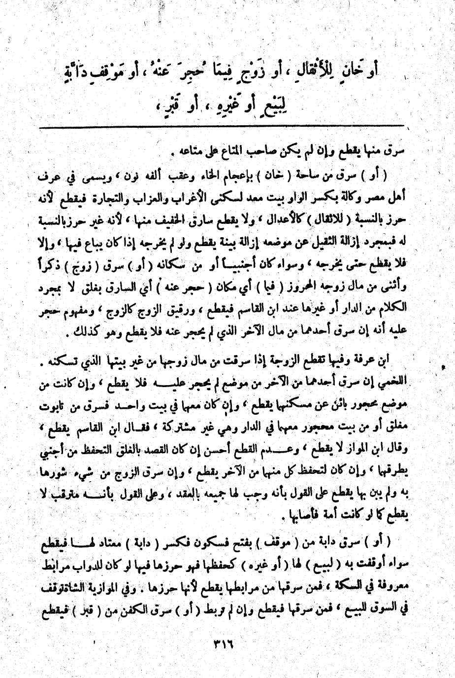 (أَوْ) سَرَقَ مِنْ سَاحَةِ (خَانْ) بِإِعْجَامِ الْخَاءِ وَعَقِبُ أَلِفِهِ نُونٌ، وَيُسَمَّى فِي عُرْفِ أَهْلِ مِصْرَ وِكَالَةٌ بِكَسْرِ الْوَاوِ بَيْتٌ مُعَدٌّ لِسُكْنَى الْأَغْرَابِ وَالْعُزَّابِ وَالتُّجَّارِ فَيُقْطَعُ لِأَنَّهُ حِرْزٌ بِالنِّسْبَةِ (لِلْأَثْقَالِ) كَالْإِعْدَالِ، وَلَا يُقْطَعُ سَارِقُ الْخَفِيفِ مِنْهَا لِأَنَّهُ غَيْرُ حِرْزٍ بِالنِّسْبَةِ لَهُ فَبِمُجَرَّدِ إزَالَةِ الثَّقِيلِ عَنْ مَوْضِعِهِ إزَالَةَ بَيِّنَةٍ يُقْطَعُ وَلَوْ لَمْ يُخْرِجْهُ إذَا كَانَ يُبَاعُ فِيهَا، وَإِلَّا فَلَا يُقْطَعُ حَتَّى يُخْرِجَهُ، وَسَوَاءٌ كَانَ أَجْنَبِيًّا أَوْ مِنْ سُكَّانِهِ (أَوْ) سَرَقَ (زَوْجٌ) ذَكَرًا وَأُنْثَى مِنْ مَالِ زَوْجِهِ الْمَحْرُوزِ (فِيمَا) أَيْ مَكَان (حُجِرَ عَنْهُ) أَيْ السَّارِقِ بِغَلْقٍ لَا بِمُجَرَّدِ الْكَلَامِ مِنْ الدَّارِ أَوْ غَيْرِهِمَا عِنْدَ ابْنِ الْقَاسِمِ فَيُقْطَعُ، وَرَقِيقُ الزَّوْجِ كَالزَّوْجِ، وَمَفْهُومُ حُجِرَ عَلَيْهِ أَنَّهُ إنْ سَرَقَ أَحَدُهُمَا مِنْ مَالِ الْآخَرِ الَّذِي لَمْ يُحْجَرْ عَنْهُ فَلَا يُقْطَعُ وَهُوَ كَذَلِكَ.