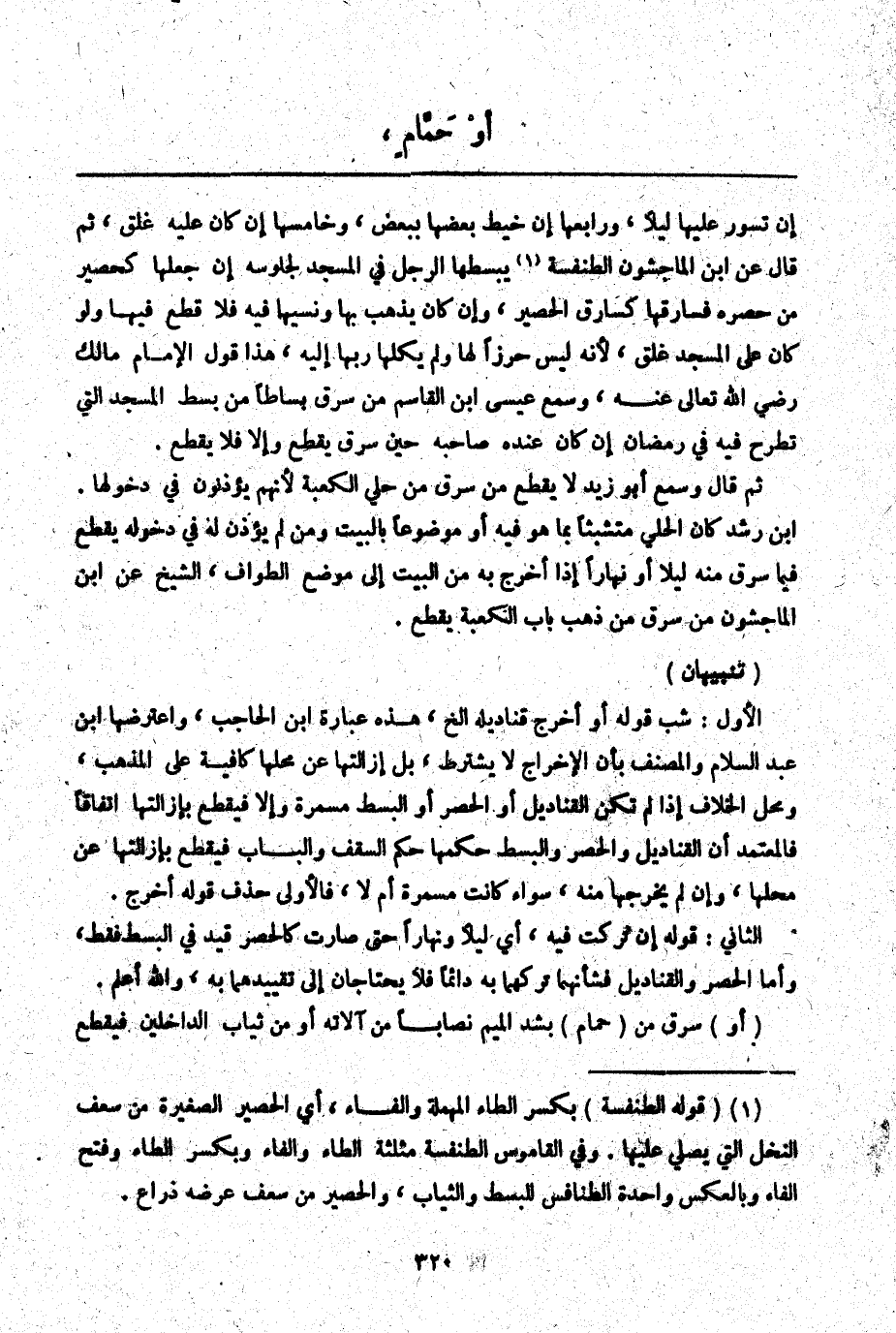 ـــــــــــــــــــــــــــــQإنْ تَسَوَّرَ عَلَيْهَا لَيْلًا، وَرَابِعُهَا إنْ خَيَّطَ بَعْضَهَا بِبَعْضٍ، وَخَامِسُهَا إنْ كَانَ عَلَيْهِ غَلْقٌ، ثُمَّ قَالَ عَنْ ابْنِ الْمَاجِشُونِ الطِّنْفِسَةُ يَبْسُطُهَا الرَّجُلُ فِي الْمَسْجِدِ لِجُلُوسِهِ إنْ جَعَلَهَا كَحَصِيرٍ مِنْ حُصْرِهِ فَسَارِقُهَا كَسَارِقِ الْحَصِيرِ، وَإِنْ كَانَ يَذْهَبُ بِهَا وَنَسِيَهَا فِيهِ فَلَا قَطْعَ فِيهَا وَلَوْ كَانَ عَلَى الْمَسْجِدِ غَلْقٌ لِأَنَّهُ لَيْسَ حِرْزًا لَهَا وَلَمْ يَكِلْهَا رَبُّهَا إلَيْهِ، هَذَا قَوْلُ الْإِمَامِ مَالِكٍ - رَضِيَ اللَّهُ تَعَالَى عَنْهُ -، وَسَمِعَ عِيسَى ابْنَ الْقَاسِمِ مَنْ سَرَقَ بِسَاطًا مِنْ بُسْطِ الْمَسْجِدِ الَّتِي تُطْرَحُ فِيهِ فِي رَمَضَانَ إنْ كَانَ عِنْدَهُ صَاحِبُهُ حِينَ سَرَقَ يُقْطَعُ وَإِلَّا فَلَا يُقْطَعُ.