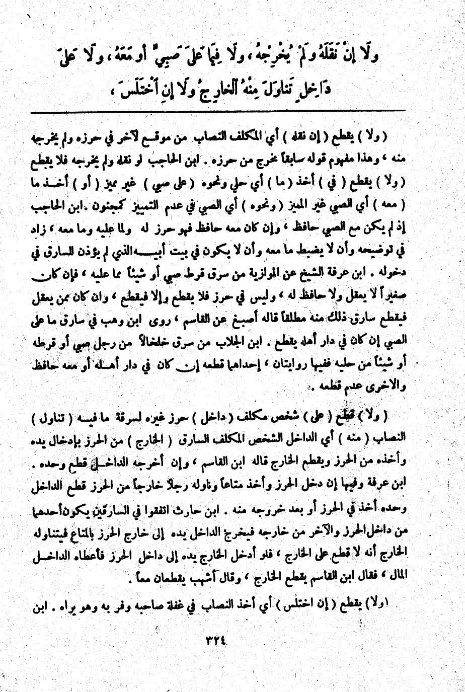 ـــــــــــــــــــــــــــــQوَلَا) يُقْطَعُ (إنْ نَقَلَهُ) أَيْ الْمُكَلَّفُ النِّصَابَ مِنْ مَوْقِعٍ لِآخَرَ فِي حِرْزِهِ وَلَمْ يُخْرِجْهُ مِنْهُ، وَهَذَا مَفْهُومُ قَوْلِهِ سَابِقًا مُخْرَجٌ مِنْ حِرْزِهِ. ابْنُ الْحَاجِبِ لَوْ نَقَلَهُ وَلَمْ يُخْرِجْهُ فَلَا يُقْطَعُ (وَلَا) يُقْطَعُ (فِي) أَخْذِ (مَا) أَيْ حُلِيٍّ وَنَحْوِهِ (عَلَى صَبِيٍّ) غَيْرِ مُمَيِّزٍ (أَوْ) خُذْ مَا (مَعَهُ) أَيْ الصَّبِيِّ غَيْرِ الْمُمَيِّزِ (وَنَحْوِهِ) أَيْ الصَّبِيِّ فِي عَدَمِ التَّمْيِيزِ كَمَجْنُونٍ. ابْنُ الْحَاجِبِ إذْ لَمْ يَكُنْ مَعَ الصَّبِيِّ حَافِظٌ، وَإِنْ كَانَ مَعَهُ حَافِظٌ فَهُوَ حِرْزٌ لَهُ وَلِمَا عَلَيْهِ وَمَا مَعَهُ، زَادَ فِي تَوْضِيحِهِ وَأَنْ لَا يُضْبَطَ مَا مَعَهُ وَأَنْ لَا يَكُونَ فِي بَيْتِ أَبِيهِ الَّذِي لَمْ يُؤْذَنْ لِلسَّارِقِ فِي دُخُولِهِ. ابْنُ عَرَفَةَ الشَّيْخُ عَنْ الْمَوَّازِيَّةِ مَنْ سَرَقَ قُرْطَ صَبِيٍّ أَوْ شَيْئًا مِمَّا عَلَيْهِ، فَإِنْ كَانَ صَغِيرًا لَا يَعْقِلُ وَلَا حَافِظَ لَهُ، وَلَيْسَ فِي حِرْزٍ فَلَا يُقْطَعُ وإلَّا فَيُقْطَعُ، وَإِنْ كَانَ مِمَّنْ يَعْقِلُ فَيُقْطَعُ سَارِقٌ ذَلِكَ مِنْهُ مُطْلَقًا قَالَهُ أَصْبَغُ عَنْ الْقَاسِمِ، رَوَى ابْنُ وَهْبٍ فِي سَارِقٍ مَا عَلَى الصَّبِيِّ إنْ كَانَ فِي دَارِ أَهْلِهِ يُقْطَعُ. ابْنُ الْجَلَّابِ مَنْ سَرَقَ خَلْخَالًا مِنْ رِجْلِ صَبِيٍّ أَوْ قُرْطَهُ أَوْ شَيْئًا مِنْ حُلِيِّهِ فَفِيهَا رِوَايَتَانِ، إحْدَاهُمَا قَطْعُهُ إنْ كَانَ فِي دَارِ أَهْلِهِ أَوْ مَعَهُ حَافِظٌ وَالْأُخْرَى عَدَمُ قَطْعِهِ.