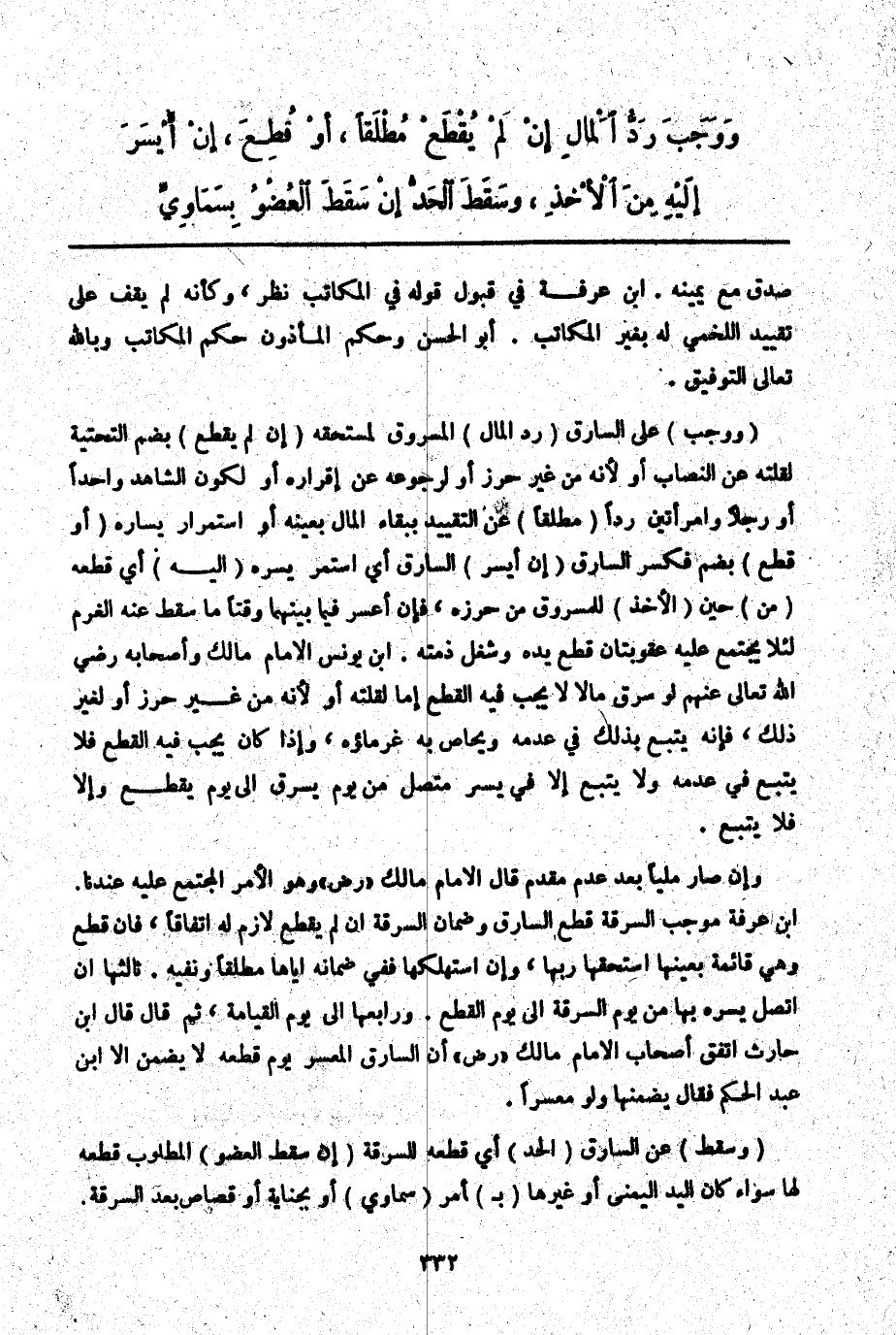 (وَوَجَبَ) عَلَى السَّارِقِ (رَدُّ الْمَالِ) الْمَسْرُوقِ لِمُسْتَحِقِّهِ (إنْ لَمْ يُقْطَعْ) بِضَمِّ التَّحْتِيَّةِ لِقِلَّتِهِ عَنْ النِّصَابِ أَوْ لِأَنَّهُ مِنْ غَيْرِ حِرْزٍ أَوْ لِرُجُوعِهِ عَنْ إقْرَارِهِ أَوْ لِكَوْنِ الشَّاهِدِ وَاحِدًا أَوْ رَجُلًا وَامْرَأَتَانِ رَدًّا (مُطْلَقًا) عَنْ التَّقْيِيدِ بِبَقَاءِ الْمَالِ بِعَيْنِهِ أَوْ اسْتِمْرَارِ يَسَارِهِ (أَوْ قُطِعَ) بِضَمٍّ فَكَسْرٍ السَّارِقُ (إنْ أَيْسَرَ) السَّارِقُ أَيْ اسْتَمَرَّ يُسْرُهُ (إلَيْهِ) أَيْ قَطْعُهُ (مِنْ) حِينِ (الْأَخْذِ) لِلْمَسْرُوقِ مِنْ حِرْزِهِ، فَإِنْ أَعْسَرَ فِيمَا بَيْنَهُمَا وَقْتًا مَا سَقَطَ عَنْهُ الْغُرْمُ لِئَلَّا يَجْتَمِعَ عَلَيْهِ عُقُوبَتَانِ قَطْعُ يَدِهِ وَشَغْلُ ذِمَّتِهِ. ابْنُ يُونُسَ الْإِمَامُ مَالِكٌ وَأَصْحَابُهُ - رَضِيَ اللَّهُ تَعَالَى عَنْهُمْ - لَوْ سَرَقَ مَالًا لَا يَجِبُ فِيهِ الْقَطْعُ إمَّا لِقِلَّتِهِ أَوْ لِأَنَّهُ مِنْ غَيْرِ حِرْزٍ أَوْ لِغَيْرِ ذَلِكَ، فَإِنَّهُ يَتْبَعُ بِذَلِكَ فِي عَدَمِهِ وَيُحَاصُّ بِهِ غُرَمَاؤُهُ، وَإِذَا كَانَ يَجِبُ فِيهِ الْقَطْعُ فَلَا يُتْبَعُ فِي عَدَمِهِ وَلَا يُتْبَعُ إلَّا فِي يُسْرٍ مُتَّصِلٍ مِنْ يَوْمٍ يَسْرِقُ إلَى يَوْمِ يُقْطَعُ وَإِلَّا فَلَا يُتْبَعُ.