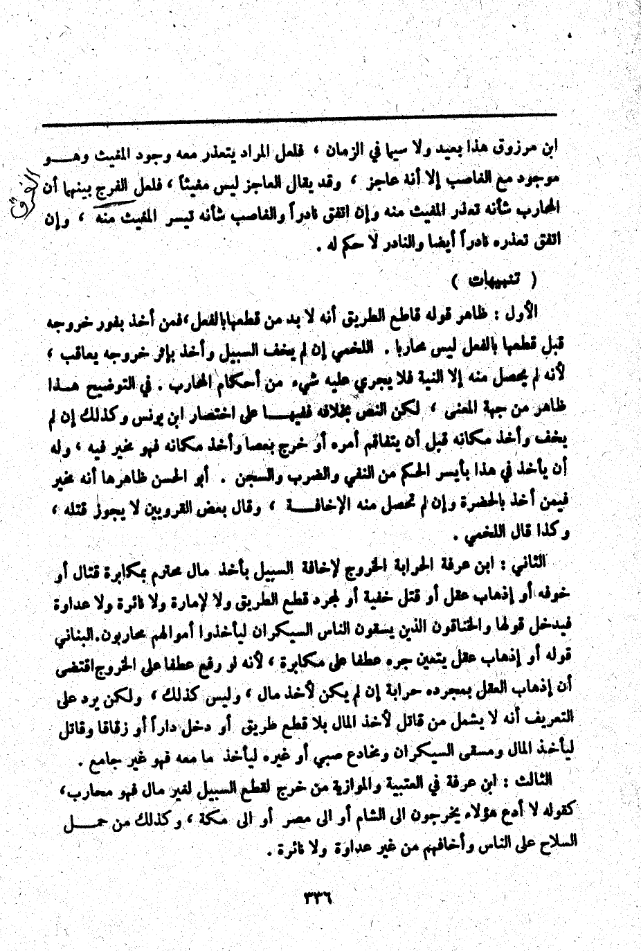 (تَنْبِيهَاتٌ) : الْأَوَّلُ: ظَاهِرُ قَوْلِهِ قَاطِعُ الطَّرِيقِ أَنَّهُ لَا بُدَّ مِنْ قَطْعِهَا بِالْفِعْلِ، فَمَنْ أَخَذَ بِفَوْرِ خُرُوجِهِ قَبْلَ قَطْعِهَا بِالْفِعْلِ لَيْسَ مُحَارِبًا. اللَّخْمِيُّ إنْ لَمْ يُخِفْ السَّبِيلَ وَأَخَذَ بِإِثْرِ خُرُوجِهِ يُعَاقَبُ لِأَنَّهُ لَمْ يَحْصُلْ مِنْهُ إلَّا النِّيَّةُ فَلَا يَجْرِي عَلَيْهِ شَيْءٌ مِنْ أَحْكَامِ الْمُحَارِبِ. فِي التَّوْضِيحِ هَذَا ظَاهِرٌ مِنْ جِهَةِ الْمَعْنَى، لَكِنَّ النَّصَّ بِخِلَافِهِ فَفِيهَا عَلَى اخْتِصَارِ ابْنِ يُونُسَ وَكَذَلِكَ إنْ لَمْ يُخِفْ وَأَخَذَ مَكَانَهُ قَبْلَ أَنْ يَتَفَاقَمَ أَمْرُهُ أَوْ خَرَجَ بِعَصًا وَأَخَذَ مَكَانَهُ فَهُوَ مُخَيَّرٌ فِيهِ، وَلَهُ أَنْ يَأْخُذَ فِي هَذَا بِأَيْسَرِ الْحُكْمِ مِنْ النَّفْيِ وَالضَّرْبِ وَالسِّجْنِ. أَبُو الْحَسَنِ ظَاهِرُهَا أَنَّهُ مُخَيَّرٌ فِيمَنْ أُخِذَ بِالْحَضْرَةِ وَإِنْ لَمْ تَحْصُلْ مِنْهُ الْإِخَافَةُ، وَقَالَ بَعْضُ الْقَرَوِيِّينَ لَا يَجُوزُ قَتْلُهُ، وَكَذَا قَالَ اللَّخْمِيُّ.