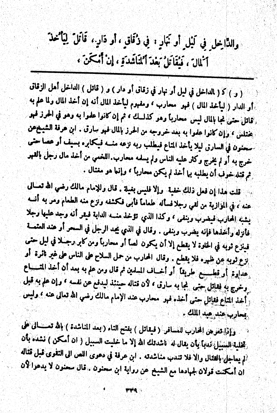 وَإِذَا تَعَرَّضَ الْمُحَارِبُ لِلْمُسَافِرِ (فَيُقَاتَلُ) بِفَتْحِ التَّاءِ (بَعْدَ الْمُنَاشَدَةِ) بِاَللَّهِ تَعَالَى عَلَى تَخْلِيَةِ السَّبِيلِ نَدْبًا بِأَنْ يُقَالَ لَهُ نَاشَدْتُك اللَّهَ إلَّا مَا خَلَّيْت السَّبِيلَ (إنْ أَمْكَنَ) نَشَدَهُ بِأَنْ لَمْ يُعَاجِلْ بِالْقِتَالِ وَإلَّا فَلَا تُنْدَبُ مُنَاشَدَتُهُ ابْنُ عَرَفَةَ فِي دَعْوَى اللِّصِّ إلَى التَّقْوَى قَبْلَ قِتَالِهِ إنْ أَمْكَنَتْ قَوْلَانِ لِجِهَادِهِ مَعَ الشَّيْخِ عَنْ رِوَايَةِ ابْنِ سَحْنُونٍ. قَالَ سَحْنُونٌ لَا يَدْعُو لِأَنَّ
