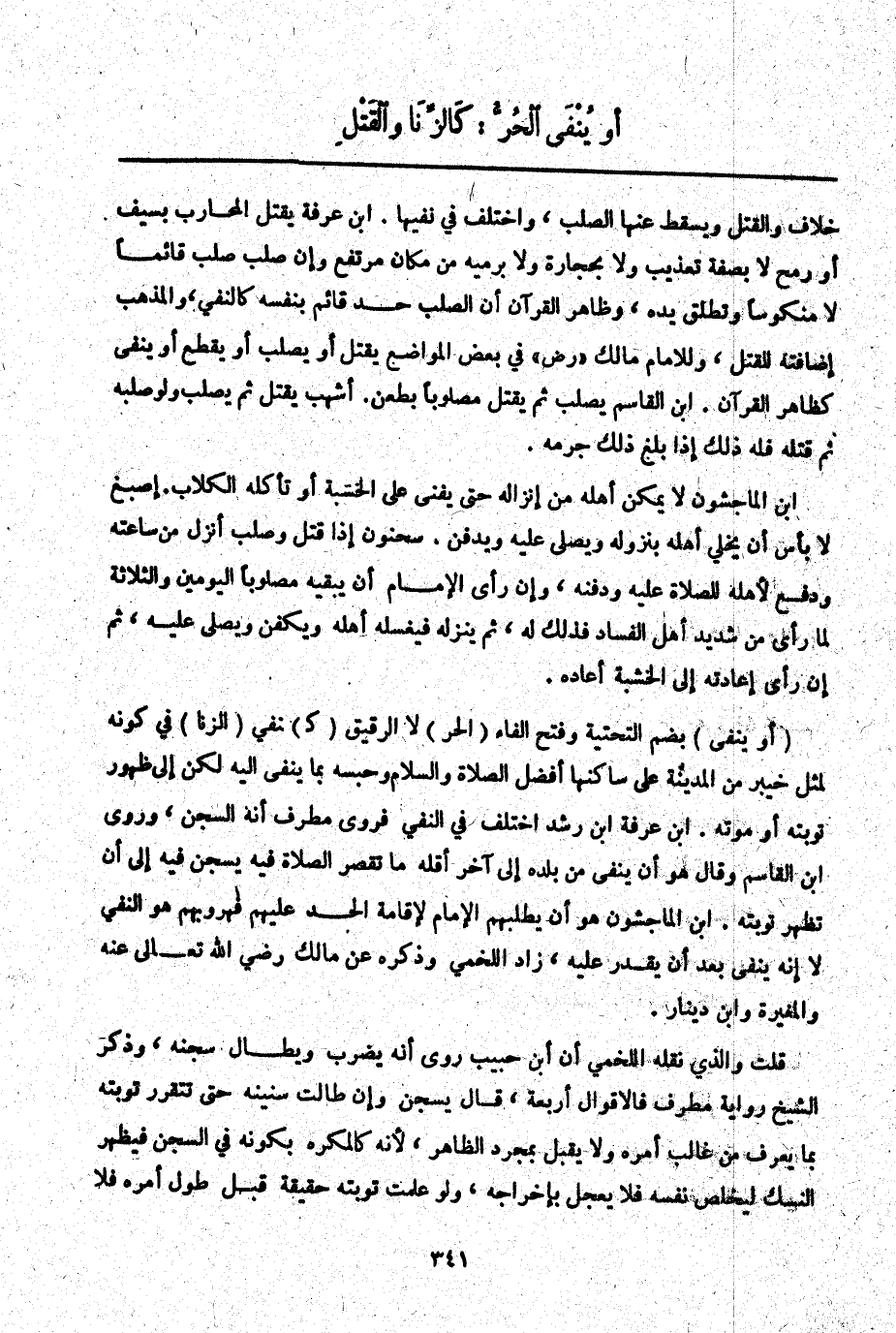 ـــــــــــــــــــــــــــــQخِلَافٍ وَالْقَتْلُ وَيَسْقُطُ عَنْهَا الصَّلْبُ، اُخْتُلِفَ فِي نَفْيِهَا. ابْنُ عَرَفَةَ يُقْتَلُ الْمُحَارَبُ بِسَيْفٍ أَوْ رُمْحٍ لَا بِصِفَةِ تَعْذِيبٍ وَلَا بِحِجَارَةٍ وَلَا بِرَمْيِهِ مِنْ مَكَان مُرْتَفِعٍ وَإِذْ صُلِبَ صُلِبَ قَائِمًا لَا مَنْكُوسًا وَتُطْلَقُ يَدُهُ وَظَاهِرُ الْقُرْآنِ أَنَّ الصَّلْبَ حَدٌّ قَائِمٌ بِنَفْسِهِ كَالنَّفْيِ وَالْمَذْهَبُ إضَافَتُهُ لِلْقَتْلِ وَلِلْإِمَامِ مَالِكٍ " - رَضِيَ اللَّهُ عَنْهُ - " فِي بَعْضِ الْمَوَاضِعِ يُقْتَلُ أَوْ يُصْلَبُ أَوْ يُقْطَعُ أَوْ يُنْفَى كَظَاهِرِ الْقُرْآنِ. ابْنُ الْقَاسِمِ يُصْلَبُ ثُمَّ يُقْتَلُ مَصْلُوبًا بِطَعْنٍ. أَشْهَبُ يُقْتَلُ ثُمَّ يُصْلَبُ وَلَوْ صَلَبَهُ ثُمَّ قَتَلَهُ فَلَهُ ذَلِكَ إذَا بَلَغَ ذَلِكَ جُرْمَهُ. ابْنُ الْمَاجِشُونِ لَا يُمَكَّنُ أَهْلُهُ مِنْ إنْزَالِهِ حَتَّى يَفْنَى عَلَى الْخَشَبَةِ أَوْ تَأْكُلَهُ الْكِلَابُ. أَصْبَغُ لَا بَأْسَ أَنْ يُخَلَّى أَهْلُهُ بِنُزُولِهِ وَيُصَلَّى عَلَيْهِ وَيُدْفَنُ. سَحْنُونٌ إذَا قُتِلَ وَصُلِبَ أُنْزِلَ مِنْ سَاعَتِهِ وَدُفِعَ لِأَهْلِهِ لِلصَّلَاةِ عَلَيْهِ وَدَفْنِهِ، وَإِنْ رَأَى الْإِمَامُ أَنْ يُبْقِيَهُ مَصْلُوبًا الْيَوْمَيْنِ وَالثَّلَاثَةَ لِمَا رَأَى مِنْ شَدِيدِ أَهْلِ الْفَسَادِ فَذَلِكَ لَهُ، ثُمَّ يُنَزِّلُهُ فَيُغَسِّلُهُ أَهْلُهُ وَيُكَفَّنُ وَيُصَلَّى عَلَيْهِ، ثُمَّ إنْ رَأَى إعَادَتَهُ إلَى الْخَشَبَةِ أَعَادَهُ. (أَوْ يُنْفَى) بِضَمِّ التَّحْتِيَّةِ وَفَتْحِ الْفَاءِ (الْحُرُّ) لَا الرَّقِيقُ (كَ) نَفْيِ (الزِّنَا) فِي كَوْنِهِ لِمِثْلِ خَيْبَرَ مِنْ الْمَدِينَةِ عَلَى سَاكِنِهَا أَفْضَلُ الصَّلَاةِ وَالسَّلَامِ وَحَبْسُهُ بِمَا يُنْفَى إلَيْهِ لَكِنْ إلَى ظُهُورِ تَوْبَتِهِ أَوْ مَوْتِهِ. ابْنُ عَرَفَةَ ابْنُ رُشْدٍ اُخْتُلِفَ فِي النَّفْيِ فَرَوَى مُطَرِّفٌ أَنَّهُ السِّجْنُ