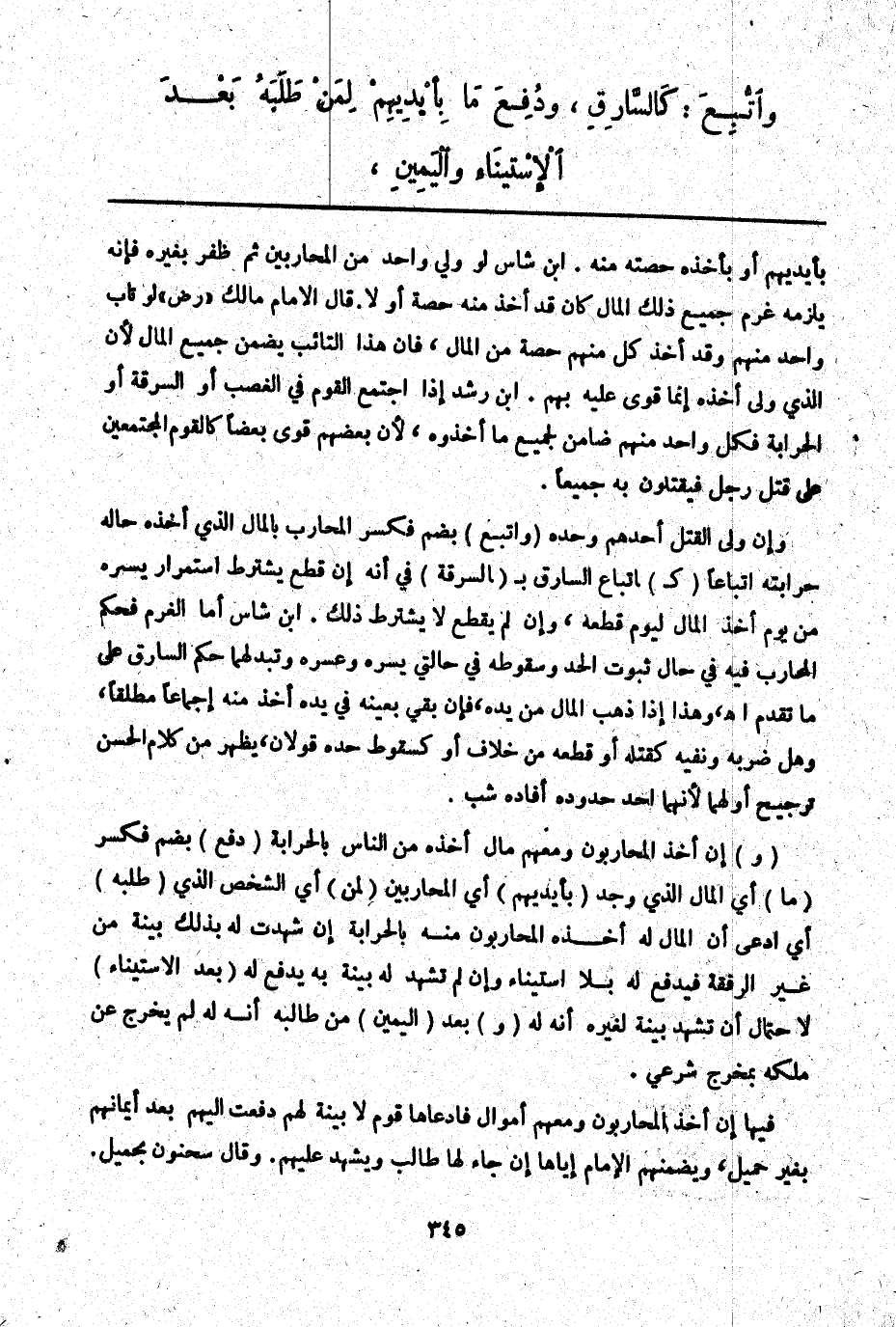 ـــــــــــــــــــــــــــــQبِأَيْدِيهِمْ أَوْ بِأَخْذِهِ حِصَّتَهُ مِنْهُ. ابْنُ شَاسٍ لَوْ وَلِيَ وَاحِدٌ مِنْ الْمُحَارِبِينَ ثُمَّ ظُفِرَ بِغَيْرِهِ فَإِنَّهُ يَلْزَمُهُ غُرْمُ جَمِيعِ ذَلِكَ الْمَالِ كَانَ قَدْ أَخَذَ مِنْهُ حِصَّةً أَوْ لَا. قَالَ الْإِمَامُ مَالِكٌ " - رَضِيَ اللَّهُ عَنْهُ - " لَوْ تَابَ وَاحِدٌ مِنْهُمْ وَقَدْ أَخَذَ كُلٌّ مِنْهُمْ حِصَّةً مِنْ الْمَالِ، فَإِنَّ هَذَا التَّائِبَ يَضْمَنُ جَمِيعَ الْمَالِ لِأَنَّ الَّذِي وَلِيَ أَخْذَهُ إنَّمَا قَوِيَ عَلَيْهِ بِهِمْ. ابْنُ رُشْدٍ إذَا اجْتَمَعَ الْقَوْمُ فِي الْغَصْبِ أَوْ السَّرِقَةِ أَوْ الْحِرَابَةِ فَكُلُّ وَاحِدٍ مِنْهُمْ ضَامِنٌ لِجَمِيعِ مَا أَخَذُوهُ لِأَنَّ بَعْضَهُمْ قَوَّى بَعْضًا كَالْقَوْمِ الْمُجْتَمِعِينَ عَلَى قَتْلِ رَجُلٍ فَيُقْتَلُونَ بِهِ جَمِيعًا. وَإِنْ وَلِيَ الْقَتْلَ أَحَدُهُمْ وَحْدَهُ (وَاتُّبِعَ) بِضَمٍّ فَكَسْرٍ الْمُحَارِبُ بِالْمَالِ الَّذِي أَخَذَهُ حَالَةَ حِرَابَتِهِ اتِّبَاعًا (كَ) اتِّبَاعِ السَّارِقِ بِ (السَّرِقَةِ) فِي أَنَّهُ إنْ قُطِعَ يُشْتَرَطُ اسْتِمْرَارُ يُسْرِهِ مِنْ يَوْمِ أَخَذَ الْمَالَ لِيَوْمِ قَطْعِهِ، وَإِنْ لَمْ يُقْطَعْ لَا يُشْتَرَطُ ذَلِكَ. ابْنُ شَاسٍ أَمَّا الْغُرْمُ فَحُكْمُ الْمُحَارِبِ فِيهِ فِي حَالِ ثُبُوتِ الْحَدِّ وَسُقُوطِهِ فِي حَالَتَيْ يُسْرِهِ وَعُسْرِهِ وَتَبَدَّلَهُمَا حُكْمُ السَّارِقِ عَلَى مَا تَقَدَّمَ. اهـ. وَهَذَا إذَا ذَهَبَ الْمَالُ مِنْ يَدِهِ، فَإِنْ بَقِيَ بِعَيْنِهِ فِي يَدِهِ أُخِذَ مِنْهُ إجْمَاعًا مُطْلَقًا، وَهَلْ ضَرْبُهُ وَنَفْيُهُ كَقَتْلِهِ أَوْ قَطْعِهِ مِنْ خِلَافٍ أَوْ كَسُقُوطِ حَدِّهِ قَوْلَانِ، يَظْهَرُ مِنْ كَلَامِ الْحَسَنِ تَرْجِيحُ أَوَّلِهِمَا لِأَنَّهُمَا أَحَدُ حُدُودِهِ أَفَادَهُ شب.