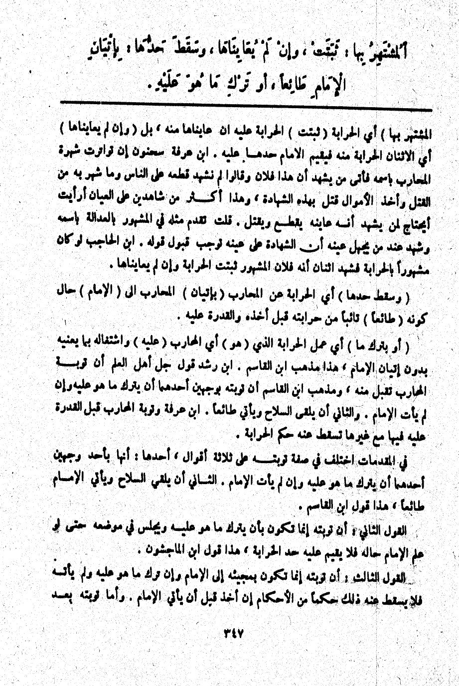 (وَسَقَطَ حَدُّهَا) أَيْ الْحِرَابَةِ عَنْ الْمُحَارِبِ (بِإِتْيَانِ) الْمُحَارِبِ إلَى (الْإِمَامِ) حَالَ كَوْنِهِ (طَائِعًا) تَائِبًا مِنْ حِرَابَتِهِ قَبْلَ أَخْذِهِ وَالْقُدْرَةِ عَلَيْهِ. (أَوْ بِتَرْكِ مَا) أَيْ عَمَلِ الْحِرَابَةِ الَّذِي (هُوَ) أَيْ الْمُحَارَبُ (عَلَيْهِ) وَاشْتِغَالُهُ بِمَا يَعْنِيهِ بِدُونِ إتْيَانِ الْإِمَامِ، هَذَا مَذْهَبُ ابْنِ الْقَاسِمِ. ابْنُ رُشْدٍ قَوْلُ جُلِّ أَهْلِ الْعِلْمِ أَنَّ تَوْبَةَ الْمُحَارِبِ تُقْبَلُ مِنْهُ وَمَذْهَبُ ابْنِ الْقَاسِمِ أَنَّ تَوْبَتَهُ بِوَجْهَيْنِ أَحَدُهُمَا أَنْ يَتْرُكَ مَا هُوَ عَلَيْهِ وَإِنْ لَمْ يَأْتِ الْإِمَامُ. وَالثَّانِي أَنْ يُلْقِيَ السِّلَاحَ وَيَأْتِيَ طَائِعًا. ابْنُ عَرَفَةَ وَتَوْبَةُ الْمُحَارِبِ قَبْلَ الْقُدْرَةِ عَلَيْهِ فِيهَا مَعَ غَيْرِهَا تُسْقِطُ عَنْهُ حُكْمَ الْحِرَابَةِ. فِي الْمُقَدِّمَاتِ اُخْتُلِفَ فِي صِفَةِ تَوْبَتِهِ عَلَى ثَلَاثَةِ أَقْوَالٍ، أَحَدُهَا: أَنَّهَا بِأَحَدِ وَجْهَيْنِ أَحَدُهُمَا: أَنْ يَتْرُكَ مَا هُوَ عَلَيْهِ وَإِنْ لَمْ يَأْتِ الْإِمَامُ. الثَّانِي: أَنْ يُلْقِيَ السِّلَاحَ وَيَأْتِيَ الْإِمَامَ طَائِعًا، هَذَا قَوْلُ ابْنِ الْقَاسِمِ.
