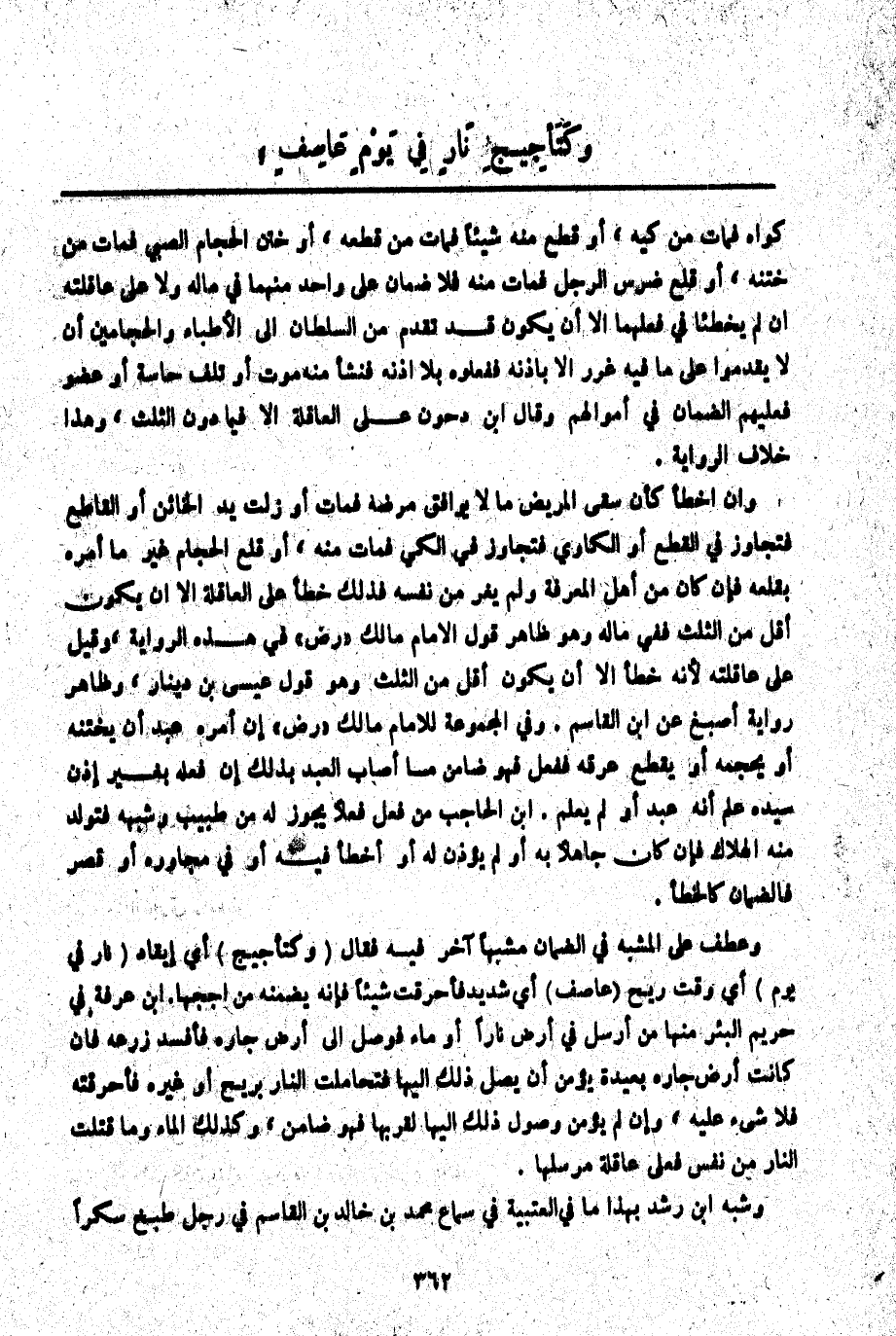 وَعَطَفَ عَلَى الْمُشَبَّهِ فِي الضَّمَانِ مُشَبَّهًا آخَرَ فِيهِ فَقَالَ (وَكَتَأْجِيجِ) أَيْ إيقَادِ (نَارٍ فِي يَوْمٍ) أَيْ وَقْتِ رِيحٍ (عَاصِفٍ) أَيْ شَدِيدٍ فَأَحْرَقَ شَيْئًا فَإِنَّهُ يَضْمَنُهُ مَنْ أَجَّجَهَا. ابْنُ عَرَفَةَ فِي حَرِيمِ الْبِئْرِ مِنْهَا مَنْ أَرْسَلَ فِي أَرْضٍ نَارًا أَوْ مَاءً فَوَصَلَ إلَى أَرْضِ جَارِهِ فَأَفْسَدَ زَرْعَهُ فَإِنْ كَانَتْ أَرْضُ جَارِهِ بَعِيدَةً يُؤْمَنُ أَنْ يَصِلَ ذَلِكَ إلَيْهَا فَتَحَامَلَتْ النَّارُ بِرِيحٍ أَوْ غَيْرِهِ فَأَحْرَقَتْهُ فَلَا شَيْءَ عَلَيْهِ، وَإِنْ لَمْ يُؤْمَنْ وُصُولُ ذَلِكَ إلَيْهَا لِقُرْبِهَا فَهُوَ ضَامِنٌ، وَكَذَلِكَ الْمَاءُ وَمَا قَتَلَتْ النَّارُ مِنْ نَفْسٍ فَعَلَى عَاقِلَةِ مُرْسِلِهَا.