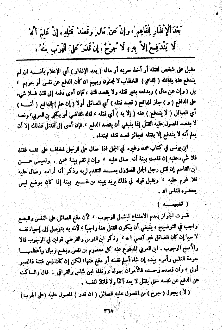 ـــــــــــــــــــــــــــــQمُقْبِلٍ عَلَى شَخْصٍ لِقَتْلِهِ أَوْ أَخْذِ حَرِيمِهِ أَوْ مَالَهُ (بَعْدَ الْإِنْذَارِ) أَيْ الْإِعْلَامِ بِأَنَّهُ إنْ لَمْ يَنْدَفِعْ عَنْهُ يُقَاتِلُهُ (لِلْفَاهِمِ) لِلْخِطَابِ لَا لِمَجْنُونٍ وَبَهِيمٍ إنْ كَانَ الدَّفْعُ عَنْ نَفْسٍ أَوْ حَرِيمٍ، بَلْ (وَإِنْ عَنْ مَالٍ) وَيَدْفَعُهُ بِغَيْرِ قَتْلِهِ وَلَا يَقْصِدُ قَتْلَهُ، فَإِنْ أَدَّى دَفْعَهُ إلَى قَتْلِهِ فَلَا شَيْءَ عَلَى الدَّافِعِ (وَ) جَازَ لِلدَّافِعِ (قَصْدُ قَتْلِهِ) أَيْ الصَّائِلِ أَوَّلًا (إنْ عَلِمَ) الدَّافِعُ (أَنَّهُ) أَيْ الصَّائِلَ (لَا يَنْدَفِعُ) عَنْهُ (إلَّا بِهِ) أَيْ قَتْلِهِ، قَالَهُ الْقَاضِي أَبُو بَكْرِ بْنُ الْعَرَبِيِّ، وَنَصُّهُ لَا يَقْصِدُ الْمَصُولُ عَلَيْهِ الْقَتْلَ إنَّمَا يَنْبَغِي أَنْ يَقْصِدَ الدَّفْعَ، فَإِنْ أَدَّى إلَى الْقَتْلِ فَذَلِكَ إلَّا أَنْ يَعْلَمَ أَنَّهُ لَا يَنْدَفِعُ إلَّا بِقَتْلِهِ فَجَائِزٌ قَصْدَ قَتْلِهِ ابْتِدَاءً. ابْنُ يُونُسَ فِي كِتَابِ مُحَمَّدٍ وَغَيْرِهِ فِي الْجَمَلِ إذَا صَالَ عَلَى الرَّجُلِ فَخَافَهُ عَلَى نَفْسِهِ فَقَتَلَهُ فَلَا شَيْءَ عَلَيْهِ إنْ قَامَتْ بَيِّنَةٌ أَنَّهُ صَالَ عَلَيْهِ، وَإِنْ لَمْ تَقُمْ بَيِّنَةٌ ضَمِنَ. وَلِعِيسَى عَنْ ابْنِ الْقَاسِمِ إنْ قَتَلَ رَجُلٌ الْجَمَلَ الصَّئُولَ بَعْدَ التَّقَدُّمِ لِرَبِّهِ وَذَكَرَ أَنَّهُ أَرَادَهُ وَصَالَ عَلَيْهِ فَلَا غُرْمَ عَلَيْهِ، وَيُقْبَلُ قَوْلُهُ فِي ذَلِكَ يُرِيدُ يَمِينَهُ مِنْ غَيْرِ بَيِّنَةٍ إذَا كَانَ بِوَضْعٍ لَيْسَ يَحْضُرُهُ النَّاسُ اهـ.