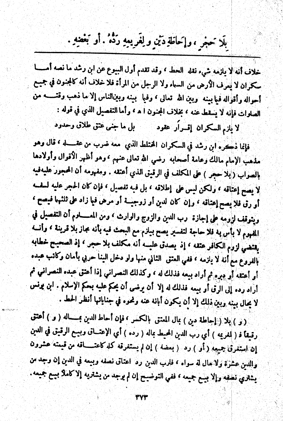 فَإِنَّمَا ذَكَرَهُ ابْنُ رُشْدٍ فِي السَّكْرَانِ الْمُخْتَلَطِ الَّذِي مَعَهُ ضَرْبٌ مِنْ عَقْلِهِ، قَالَ وَهُوَ مَذْهَبُ الْإِمَامِ مَالِكٍ وَعَامَّةِ أَصْحَابِهِ - رَضِيَ اللَّهُ تَعَالَى عَنْهُمْ -، وَهُوَ أَظْهَرُ الْأَقْوَالِ وَأَوْلَاهَا بِالصَّوَابِ (بِلَا حَجْرٍ) عَلَى الْمُكَلَّفِ فِي الرَّقِيقِ الَّذِي أَعْتَقَهُ. وَمَفْهُومُهُ أَنَّ الْمَحْجُورَ عَلَيْهِ فِيهِ لَا يَصِحُّ إعْتَاقُهُ، وَلَكِنْ لَيْسَ عَلَى إطْلَاقِهِ، بَلْ فِيهِ تَفْصِيلٌ، فَإِنْ كَانَ الْحَجْرُ عَلَيْهِ لِسَفَهٍ أَوْ رِقٍّ فَلَا يَصِحُّ إعْتَاقُهُ، وَإِنْ كَانَ لِدَيْنٍ أَوْ زَوْجِيَّةٍ أَوْ مَرَضٍ فِيمَا زَادَ عَلَى ثُلُثِهِمَا فَيَصِحُّ، وَيَتَوَقَّفُ لُزُومُهُ عَلَى إجَازَةِ رَبِّ الدَّيْنِ وَالزَّوْجِ وَالْوَارِثِ، وَمِنْ الْمَعْلُومِ أَنَّ التَّفْصِيلَ فِي الْمَفْهُومِ لَا بَأْسَ بِهِ فَلَا حَاجَةَ لِتَفْسِيرٍ يَصِحُّ بِيَلْزَمُ مَعَ الْبَحْثِ فِيهِ بِأَنَّهُ مَجَازٌ بِلَا قَرِينَةٍ، وَأَنَّهُ يَقْتَضِي لُزُومَ الْكَافِرِ عِتْقُهُ إذْ يَصْدُقُ عَلَيْهِ أَنَّهُ مُكَلَّفٌ بِلَا حَجْرٍ، إذْ الصَّحِيحُ خِطَابُهُ بِالْفُرُوعِ مَعَ أَنَّهُ يَلْزَمُهُ، فَفِي الْعِتْقِ الثَّانِي مِنْهَا وَلَوْ دَخَلَ إلَيْنَا حَرْبِيٌّ بِأَمَانٍ وَكَاتَبَ عَبْدَهُ أَوْ أَعْتَقَهُ أَوْ دَبَّرَهُ ثُمَّ أَرَادَ بَيْعَهُ فَذَلِكَ لَهُ، وَكَذَلِكَ النَّصْرَانِيُّ إذَا أَعْتَقَ عَبْدَهُ النَّصْرَانِيَّ ثُمَّ أَرَادَ رَدَّهُ إلَى الرِّقِّ أَوْ بَيْعَهُ فَذَلِكَ لَهُ إلَّا أَنْ يَرْضَى أَنْ يُحْكَمَ عَلَيْهِ بِحُكْمِ الْإِسْلَامِ. ابْنُ يُونُسَ لَا يُحَالُ بَيْنَهُ وَبَيْنَ ذَلِكَ إلَّا أَنْ يَكُونَ أَبَانَهُ عَنْهُ وَنَحْوُهُ فِي جِنَايَاتِهَا اُنْظُرْ الْحَطّ.