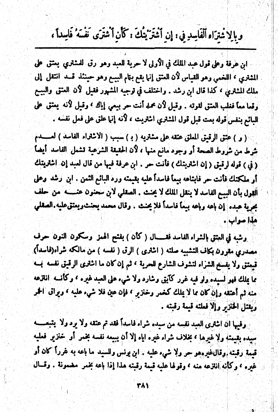 وَفِيهَا إنْ اشْتَرَى الْعَبْدَ نَفْسَهُ مِنْ سَيِّدِهِ شِرَاءً فَاسِدًا فَقَدْ تَمَّ عِتْقُهُ وَلَا يُرَدُّ وَلَا يَتْبَعُهُ سَيِّدُهُ بِقِيمَتِهِ وَلَا غَيْرِهَا، بِخِلَافِ شِرَاءِ غَيْرِهِ إيَّاهُ إلَّا أَنْ يَبِيعَهُ نَفْسَهُ بِخَمْرٍ أَوْ خِنْزِيرٍ فَعَلَيْهِ قِيمَةُ رَقَبَتِهِ. وَقَالَ غَيْرُهُ هُوَ حُرٌّ وَلَا شَيْءَ عَلَيْهِ. ابْنُ يُونُسَ وَلِلسَّيِّدِ مَا بَاعَهُ بِهِ غَرَرًا كَانَ أَوْ غَيْرَهُ، وَكَأَنَّهُ انْتَزَعَهُ مِنْهُ، وَقَوْلُهَا عَلَيْهِ قِيمَةُ رَقَبَتِهِ هَذَا إذَا بَاعَهُ بِخَمْرٍ مَضْمُونَةٍ. وَقَالَ