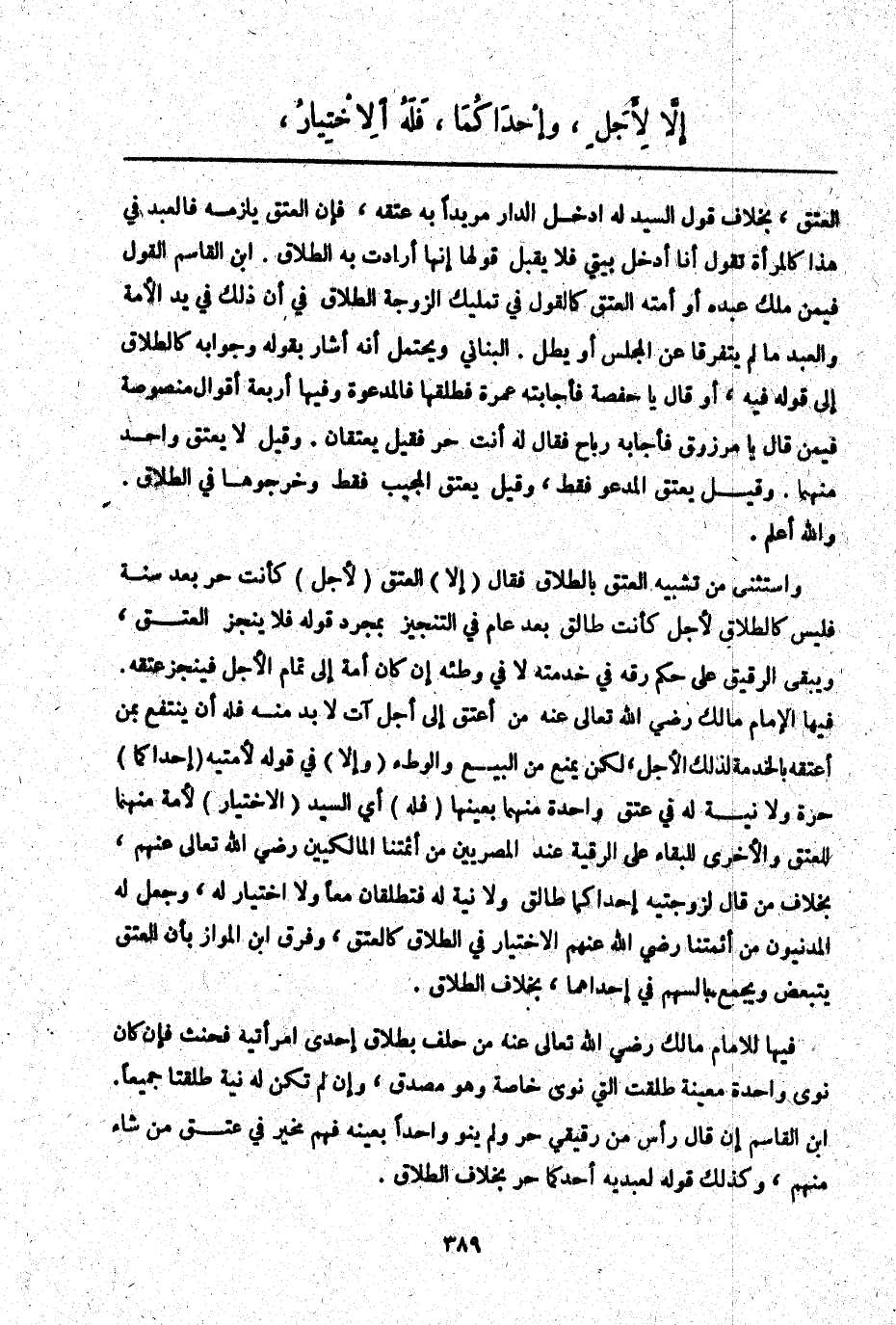 وَاسْتُثْنِيَ مِنْ تَشْبِيهِ الْعِتْقِ بِالطَّلَاقِ فَقَالَ (إلَّا) الْعِتْقَ (لِأَجَلٍ) كَأَنْتَ حُرٌّ بَعْدَ سَنَةٍ فَلَيْسَ كَالطَّلَاقِ لِأَجَلٍ كَأَنْتِ طَالِقٌ بَعْدَ عَامٍ فِي التَّنْجِيزِ بِمُجَرَّدِ قَوْلِهِ فَلَا يُنَجَّزُ الْعِتْقُ، وَيَبْقَى الرَّقِيقُ عَلَى حُكْمِ رِقِّهِ فِي خِدْمَتِهِ لَا فِي وَطْئِهِ إنْ كَانَ أَمَةً إلَى تَمَامِ الْأَجَلِ فَيُنَجَّزُ عِتْقُهُ. فِيهَا الْإِمَامُ مَالِكٌ - رَضِيَ اللَّهُ تَعَالَى عَنْهُ - مَنْ أَعْتَقَ إلَى أَجَلٍ آتٍ لَا بُدَّ مِنْهُ فَلَهُ أَنْ يَنْتَفِعَ بِمَنْ أَعْتَقَهُ بِالْخِدْمَةِ لِذَلِكَ الْأَجَلِ، لَكِنْ يُمْنَعُ مِنْ الْبَيْعِ وَالْوَطْءِ (وَإِلَّا) فِي قَوْلِهِ لِأَمَتَيْهِ (إحْدَاكُمَا) حُرَّةٌ وَلَا نِيَّةَ لَهُ فِي عِتْقِ وَاحِدَةٍ مِنْهُمَا بِعَيْنِهَا (فَلَهُ) أَيْ السَّيِّدِ (الِاخْتِيَارُ) لِأَمَةٍ مِنْهُمَا لِلْعِتْقِ وَالْأُخْرَى لِلْبَقَاءِ عَلَى الرِّقِّيَّةِ عِنْدَ الْمِصْرِيِّينَ مِنْ أَئِمَّتِنَا الْمَالِكِيِّينَ - رَضِيَ اللَّهُ تَعَالَى عَنْهُمْ -، بِخِلَافِ مَنْ قَالَ لِزَوْجَتَيْهِ إحْدَاكُمَا طَالِقٌ وَلَا نِيَّةَ لَهُ فَتَطْلُقَانِ مَعًا وَلَا اخْتِيَارَ لَهُ، وَجَعَلَ لَهُ الْمَدَنِيُّونَ مِنْ أَئِمَّتِنَا - رَضِيَ اللَّهُ عَنْهُمْ - الِاخْتِيَارَ فِي الطَّلَاقِ كَالْعِتْقِ، وَفَرَّقَ ابْنُ الْمَوَّازِ بِأَنَّ الْعِتْقَ يَتَبَعَّضُ وَيُجْمَعُ بِالسَّهْمِ فِي إحْدَاهُمَا، بِخِلَافِ الطَّلَاقِ. فِيهَا لِلْإِمَامِ مَالِكٍ - رَضِيَ اللَّهُ تَعَالَى عَنْهُ - مَنْ حَلَفَ بِطَلَاقِ إحْدَى امْرَأَتَيْهِ فَحَنِثَ فَإِنْ كَانَ نَوَى وَاحِدَةً مُعَيَّنَةً طَلُقَتْ الَّتِي نَوَى خَاصَّةً وَهُوَ مُصَدَّقٌ، وَإِنْ لَمْ تَكُنْ لَهُ نِيَّةٌ طَلُقَتَا جَمِيعًا. ابْنُ الْقَاسِمِ إنْ قَالَ رَأْسٌ مِنْ رَقِيقِي حُرٌّ وَلَمْ يَنْوِ وَاحِدًا بِعَيْنِهِ فَهُوَ مُخَيَّرٌ فِي عِتْقِ مَنْ شَاءَ مِنْهُمْ، وَكَذَلِكَ قَوْلُهُ لِعَبْدَيْهِ أَحَدُكُمَا حُرٌّ بِخِلَافِ الطَّلَاقِ.