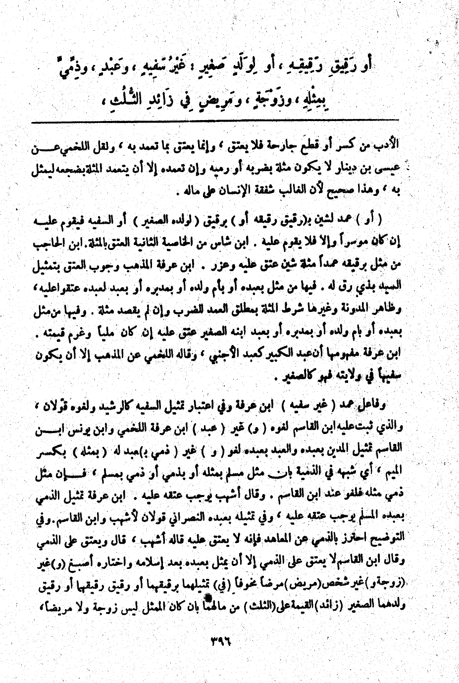 وَفَاعِلُ عَمَدَ (غَيْرُ سَفِيهٍ) ابْنُ عَرَفَةَ وَفِي اعْتِبَارِ تَمْثِيلِ السَّفِيهِ كَالرَّشِيدِ وَلَغْوِهِ قَوْلَانِ، وَاَلَّذِي ثَبَتَ عَلَيْهِ ابْنُ الْقَاسِمِ لَغْوُهُ (وَ) غَيْرُ (عَبْدٍ) ابْنُ عَرَفَةَ اللَّخْمِيُّ وَابْنُ يُونُسَ ابْنُ الْقَاسِمِ تَمْثِيلُ الْمَدِينِ بِعَبْدِهِ وَالْعَبْدِ بِعَبْدِهِ لَغْوٌ (وَ) غَيْرُ (ذِمِّيٍّ بِ) عَبْدٍ لَهُ (بِمِثْلِهِ) بِكَسْرِ الْمِيمِ، أَيْ شَبَهِهِ فِي الذِّمِّيَّةِ بِأَنْ مَثَّلَ مُسْلِمٌ بِمِثْلِهِ أَوْ بِذِمِّيٍّ أَوْ ذِمِّيٌّ بِمُسْلِمٍ، فَإِنْ مَثَّلَ ذِمِّيٌّ بِمِثْلِهِ فَلَغْوٌ عِنْدَ ابْنِ الْقَاسِمِ. وَقَالَ أَشْهَبُ يُوجِبُ عِتْقَهُ عَلَيْهِ. ابْنُ عَرَفَةَ تَمْثِيلُ الذِّمِّيِّ بِعَبْدِهِ الْمُسْلِمِ يُوجِبُ عِتْقَهُ عَلَيْهِ، وَفِي تَمْثِيلِهِ بِعَبْدِهِ النَّصْرَانِيِّ قَوْلَانِ لِأَشْهَبَ وَابْنِ الْقَاسِمِ. وَفِي التَّوْضِيحِ اُحْتُرِزَ بِالذِّمِّيِّ عَنْ الْمُعَاهَدِ فَإِنَّهُ لَا يَعْتِقُ عَلَيْهِ قَالَهُ أَشْهَبُ، قَالَ وَيَعْتِقُ عَلَى الذِّمِّيِّ وَقَالَ ابْنُ الْقَاسِمِ لَا يَعْتِقُ عَلَى الذِّمِّيِّ إلَّا أَنْ يُمَثِّلَ بِعَبْدِهِ بَعْدَ إسْلَامِهِ وَاخْتَارَهُ أَصْبَغُ (وَ) غَيْرُ (زَوْجَةٍ وَ) غَيْرُ شَخْصٍ (مَرِيضٍ) مَرَضًا مَخُوفًا (فِي) تَمْثِيلِهِمَا بِرَقِيقِهِمَا أَوْ رَقِيقِ رَقِيقِهِمَا أَوْ رَقِيقِ وَلَدِهَا الصَّغِيرِ (زَائِدِ) الْقِيمَةِ عَلَى (الثُّلُثِ) مِنْ مَالِهِمَا بِأَنْ كَانَ الْمُمَثِّلَ لَيْسَ زَوْجَةً وَلَا مَرِيضًا،