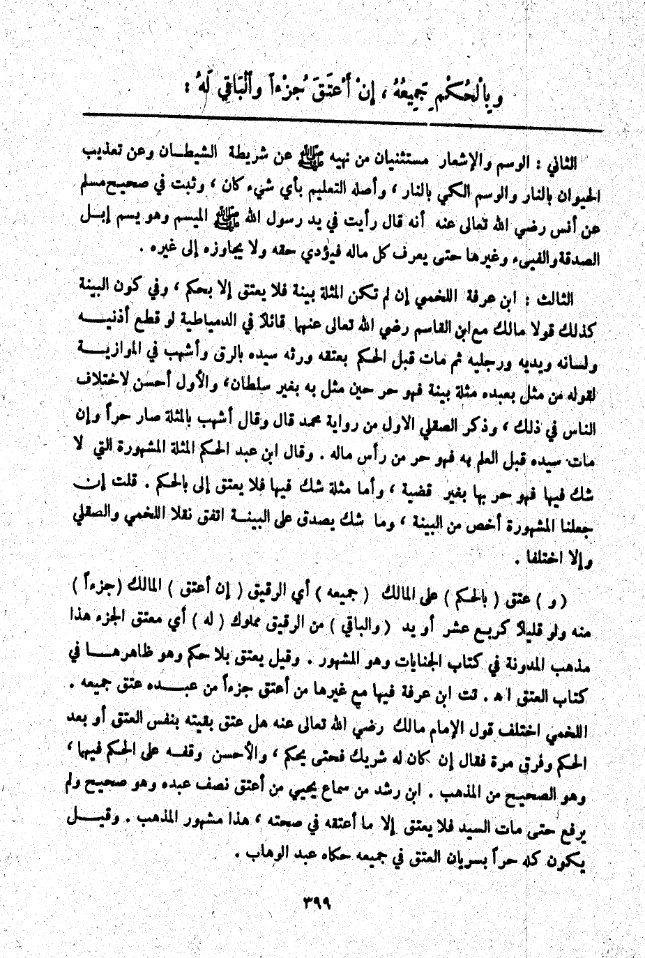 (وَ) عَتَقَ (بِالْحُكْمِ) عَلَى الْمَالِكِ (جَمِيعُهُ) أَيْ الرَّقِيقِ (إنْ أَعْتَقَ) الْمَالِكُ (جُزْءًا) مِنْهُ وَلَوْ قَلِيلًا كَرُبُعِ عُشْرٍ أَوْ يَدٍ (وَالْبَاقِي) مِنْ الرَّقِيقِ مَمْلُوكٌ (لَهُ) أَيْ مُعْتِقُ الْجُزْءِ هَذَا مَذْهَبُ الْمُدَوَّنَةِ فِي كِتَابِ الْجِنَايَاتِ وَهُوَ الْمَشْهُورُ. وَقِيلَ يَعْتِقُ بِلَا حُكْمٍ وَهُوَ ظَاهِرُهَا فِي كِتَابِ الْعِتْقِ اهـ. تت ابْنُ عَرَفَةَ فِيهَا مَعَ غَيْرِهَا مَنْ أَعْتَقَ جُزْءًا مِنْ عَبْدِهِ عَتَقَ جَمِيعُهُ. اللَّخْمِيُّ اخْتَلَفَ قَوْلُ الْإِمَامِ مَالِكٍ - رَضِيَ اللَّهُ تَعَالَى عَنْهُ - هَلْ عَتَقَ بَقِيَّتُهُ بِنَفْسِ الْعِتْقِ أَوْ بَعْدَ الْحُكْمِ وَفَرَّقَ مَرَّةً فَقَالَ إنْ كَانَ لَهُ شَرِيكٌ فَحَتَّى يَحْكُمَ وَالْأَحْسَنُ وَقْفُهُ عَلَى الْحُكْمِ فِيهِمَا، وَهُوَ الصَّحِيحُ مِنْ الْمَذْهَبِ. ابْنُ رُشْدٍ مِنْ سَمَاعِ يَحْيَى مَنْ أَعْتَقَ نِصْفَ عَبْدِهِ وَهُوَ صَحِيحٌ وَلَمْ يَرْفَعْ حَتَّى مَاتَ السَّيِّدُ فَلَا يَعْتِقُ إلَّا مَا أَعْتَقَهُ فِي صِحَّتِهِ، هَذَا مَشْهُورُ الْمَذْهَبِ. وَقِيلَ يَكُونُ كُلُّهُ حُرًّا بِسَرَيَانِ الْعِتْقِ فِي جَمِيعِهِ حَكَاهُ عَبْدُ الْوَهَّابِ.
