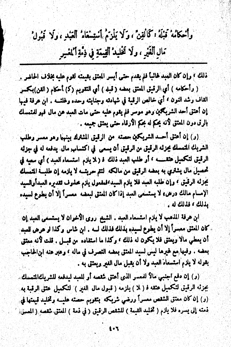 (وَأَحْكَامُهُ) أَيْ الرَّقِيقِ الْمُعْتَقِ بَعْضُهُ (قَبْلَهُ) أَيْ التَّقْوِيمِ (كَ) أَحْكَامِ (الْقِنِّ) بِكَسْرِ الْقَافِ وَشَدِّ النُّونِ، أَيْ خَالِصِ الرَّقَبَةِ فِي شَهَادَتِهِ وَجِنَايَتِهِ وَحَدِّهِ وَغَلَّتِهِ. ابْنُ عَرَفَةَ فِيهَا إنْ أَعْتَقَ أَحَدُ الشَّرِيكَيْنِ وَهُوَ مُوسِرٌ فَلَمْ يُقَوَّمْ عَلَيْهِ حَتَّى مَاتَ الْعَبْدُ عَنْ مَالٍ فَهُوَ لِلْمُتَمَسِّكِ بِالرِّقِّ دُونَ الْمُعْتِقِ لِأَنَّهُ يُحْكَمُ لَهُ بِحُكْمِ الْأَرِقَّاءِ حَتَّى يَعْتِقَ جَمِيعُهُ.