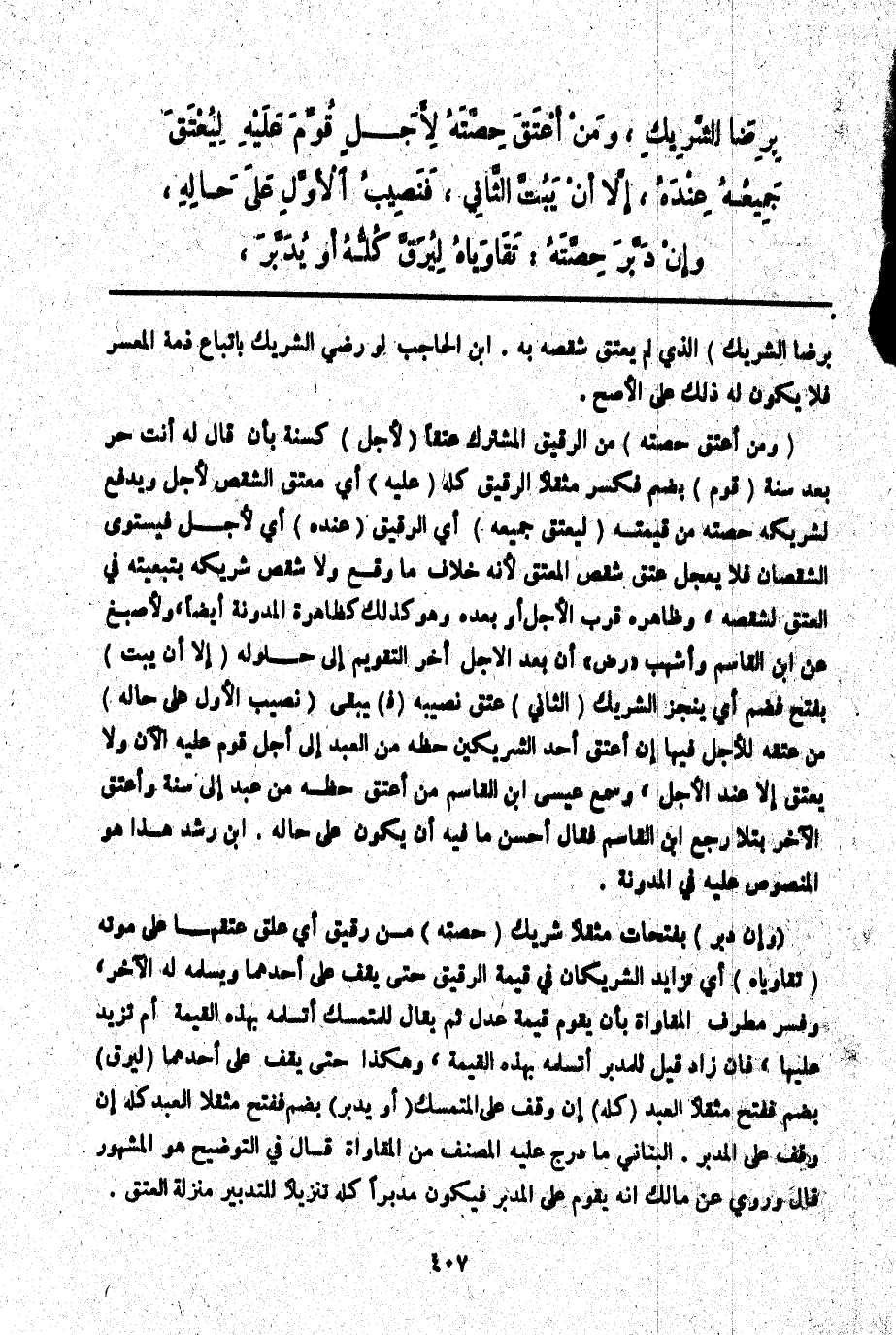 دَبَّرَ بِفَتَحَاتِ مُثَقَّلًا شَرِيكٌ حِصَّته مِنْ رَقِيق أَيْ عَلَّقَ عِتْقهَا عَلَى مَوْته وَإِنْ دَبَّرَ حِصَّتَهُ: تَقَاوَيَاهُ لِيُرَقَّ كُلُّهُ أَوْ يُدَبَّرُ.