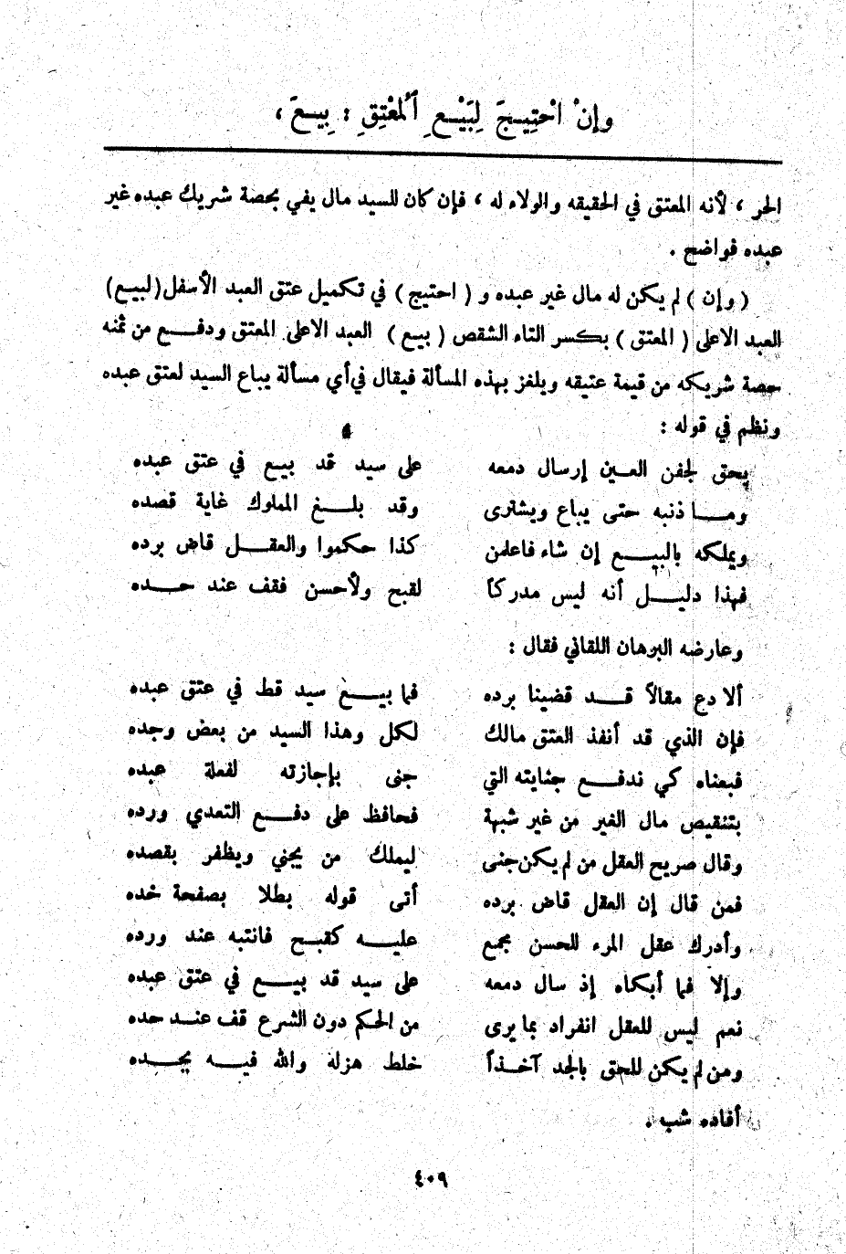 يَحِقُّ لِجَفْنِ الْعَيْنِ إرْسَالُ دَمْعِهِ ... عَلَى سَيِّدٍ قَدْ بِيعَ فِي عِتْقِ عَبْدِهِ