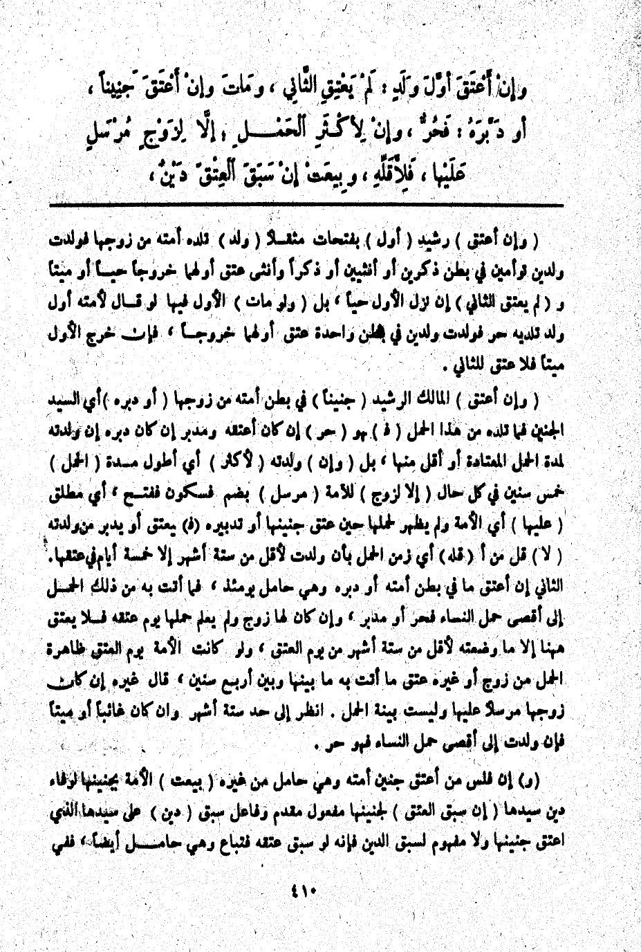 ـــــــــــــــــــــــــــــQوَإِنْ أَعْتَقَ) رَشِيدٌ (أَوَّلَ) بِفَتَحَاتٍ مُثَقَّلًا (وَلَدٍ) تَلِدُهُ أَمَتُهُ مِنْ زَوْجِهَا فَوَلَدَتْ وَلَدَيْنِ تَوْأَمَيْنِ فِي بَطْنٍ ذَكَرَيْنِ أَوْ أُنْثَيَيْنِ أَوْ ذَكَرًا وَأُنْثَى عَتَقَ أَوَّلُهُمَا خُرُوجًا حَيًّا أَوْ مَيِّتًا وَ (لَمْ يَعْتِقْ الثَّانِي) إنْ نَزَلَ الْأَوَّلُ حَيًّا، بَلْ (وَلَوْ مَاتَ) الْأَوَّلُ، فِيهَا لَوْ قَالَ لِأَمَتِهِ أَوَّلُ وَلَدٍ تَلِدِيهِ حُرٌّ فَوَلَدَتْ وَلَدَيْنِ فِي بَطْنٍ وَاحِدَةٍ عَتَقَ أَوَّلُهُمَا خُرُوجًا، فَإِنْ خَرَجَ الْأَوَّلُ مَيِّتًا فَلَا عِتْقَ لِلثَّانِي.